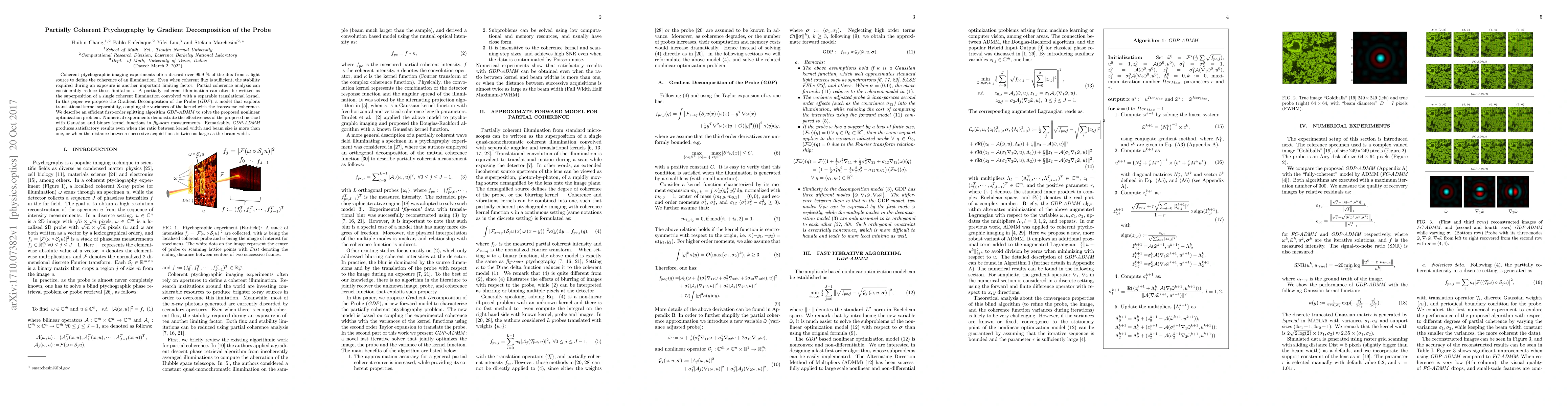 Coherent ptychographic imaging experiments often discard over 99.9 % of the flux from a light source to define the coherence of an illumination. Even when coherent flux is sufficient, the stability required during an exposure is another important limiting factor. Partial coherence analysis can considerably reduce these limitations. A partially coherent illumination can often be written as the superposition of a single coherent illumination convolved with a separable translational kernel. In this paper we propose the Gradient Decomposition of the Probe (GDP), a model that exploits translational kernel separability, coupling the variances of the kernel with the transverse coherence. We describe an efficient first-order splitting algorithm GDP-ADMM to solve the proposed nonlinear optimization problem. Numerical experiments demonstrate the effectiveness of the proposed method with Gaussian and binary kernel functions in fly-scan measurements. Remarkably, GDP-ADMM produces satisfactory results even when the ratio between kernel width and beam size is more than one, or when the distance between successive acquisitions is twice as large as the beam width.