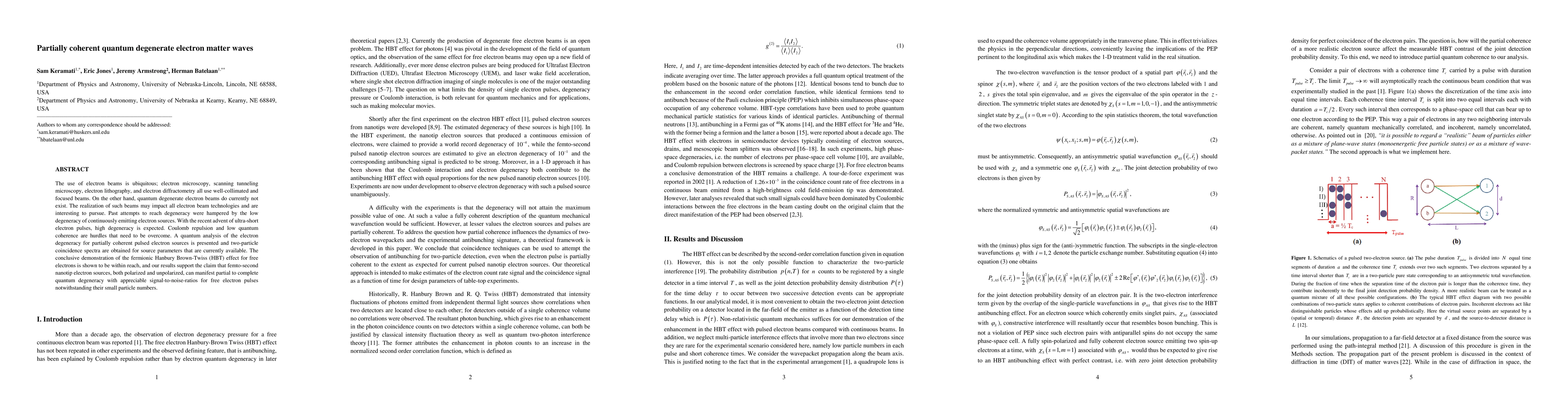 The use of electron beams is ubiquitous; electron microscopy, scanning tunneling microscopy, electron lithography, and electron diffractometry all use well-collimated and focused beams. On the other hand, quantum degenerate electron beams do currently not exist. The realization of such beams may impact all electron beam technologies and are interesting to pursue. Past attempts to reach degeneracy were hampered by the low degeneracy of continuously emitting electron sources. With the recent advent of ultra-short electron pulses, high degeneracy is expected. Coulomb repulsion and low quantum coherence are hurdles that need to be overcome. A quantum analysis of the electron degeneracy for partially coherent pulsed electron sources is presented. Two-particle coincidence spectra are obtained for source parameters that are currently available. The conclusive demonstration of the fermionic Hanbury-Brown Twiss (HBT) effect for free electrons is shown to be within reach, and our results support the claim that femto-second nanotip electron sources, both polarized and unpolarized, can manifest partial to complete quantum degeneracy with appreciable signal-to-noise-ratios for free electron pulses notwithstanding their small particle numbers.