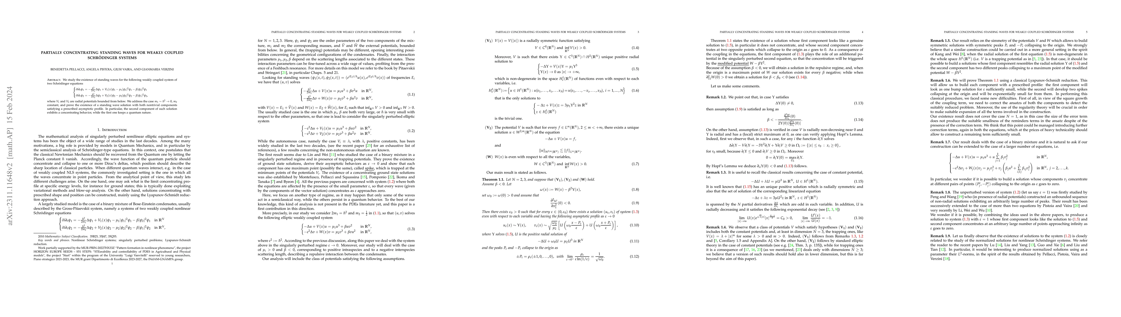 We study the existence of standing waves for the following weakly coupled system of two Schr\"odinger equations in $\mathbb{R}^N$, $N=2,3$, \[ \begin{cases} i \hslash \partial_{t}\psi_{1}=-\frac{\hslash^2}{2m_{1}}\Delta \psi_{1}+ {V_1}(x)\psi_{1}-\mu_{1}|\psi_{1}|^{2}\psi_{1}-\beta|\psi_{2}|^{2}\psi_{1} & \\ i \hslash \partial_{t}\psi_{2}=-\frac{\hslash^2}{2m_{2}}\Delta \psi_{2}+ {V_2}(x)\psi_{2}-\mu_{2}|\psi_{2}|^{2}\psi_{2}-\beta|\psi_{1}|^{2}\psi_{2},& \end{cases} \] where $V_1$ and $V_2$ are radial potentials bounded from below. We address the case $m_{1}\sim \hslash^2\to0$, $m_2$ constant, and prove the existence of a standing wave solution with both nontrivial components satisfying a prescribed asymptotic profile. In particular, the second component of such solution exhibits a concentrating behavior, while the first one keeps a quantum nature.