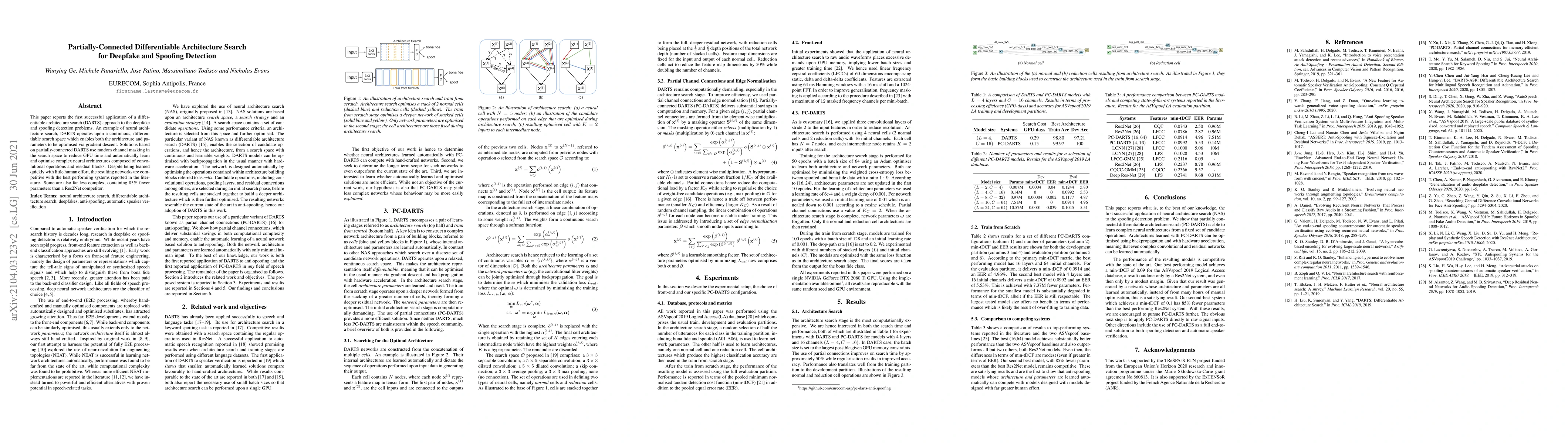This paper introduces a differentiable architecture search (DARTS) for detecting deepfakes and spoofing, optimizing both architecture and parameters via gradient descent. The partially-connected DARTS approach reduces computational costs and achieves competitive performance with significantly fewer parameters compared to existing methods.
