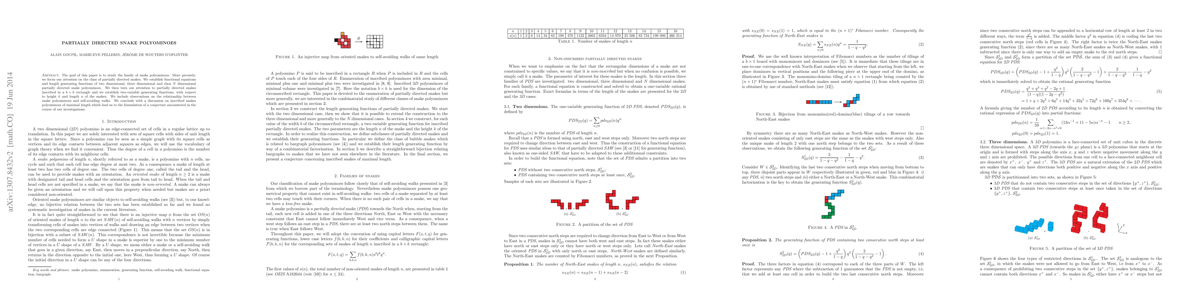 This paper investigates partially directed snake polyominoes, establishing functional equations and generating functions for their dimensions in two, three, and $N$ dimensions. It also explores two-variable generating functions for snakes inscribed in $b\times k$ rectangles and discusses their relation to self-avoiding walks, concluding with a conjecture on maximal length inscribed snakes.
