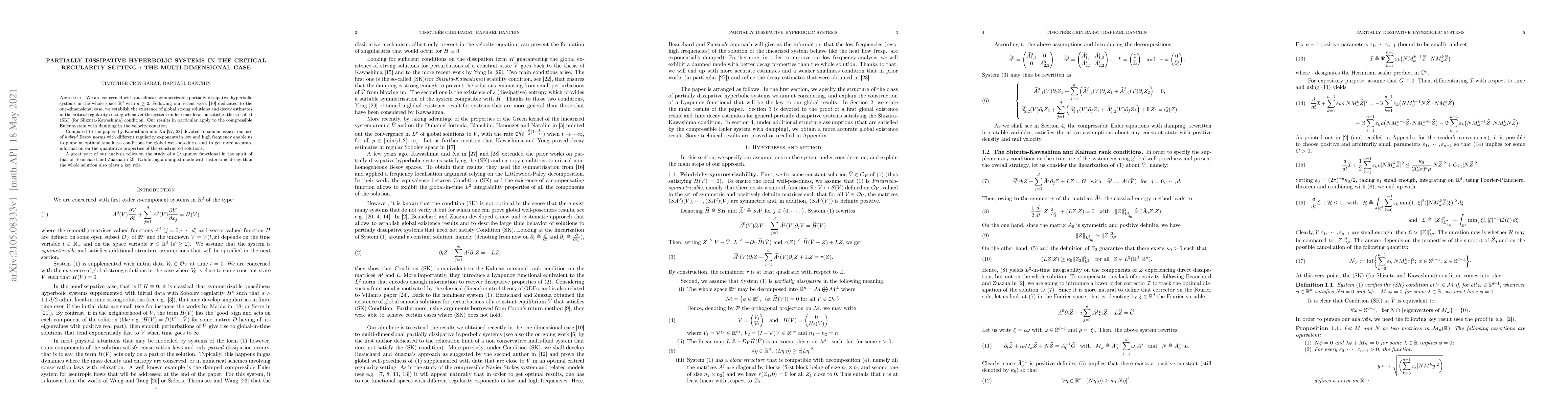 We are concerned with quasilinear symmetrizable partially dissipative hyperbolic systems in the whole space $\mathbb{R}^d$ with $d\geq2$. Following our recent work [10] dedicated to the one-dimensional case, we establish the existence of global strong solutions and decay estimates in the critical regularity setting whenever the system under consideration satisfies the so-called (SK) (for Shizuta-Kawashima) condition. Our results in particular apply to the compressible Euler system with damping in the velocity equation. Compared to the papers by Kawashima and Xu [27, 28] devoted to similar issues, our use of hybrid Besov norms with different regularity exponents in low and high frequency enable us to pinpoint optimal smallness conditions for global well-posedness and to get more accurate information on the qualitative properties of the constructed solutions. A great part of our analysis relies on the study of a Lyapunov functional in the spirit of that of Beauchard and Zuazua in [2]. Exhibiting a damped mode with faster time decay than the whole solution also plays a key role.