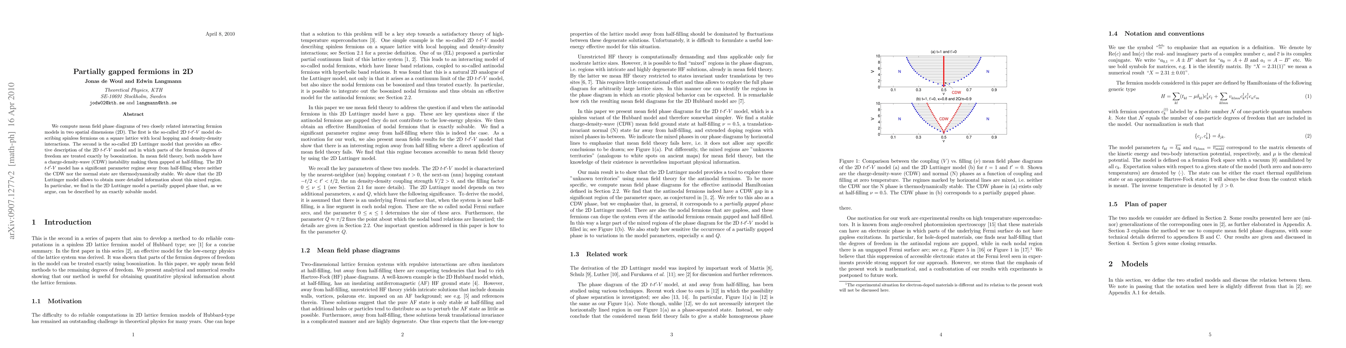 We compute mean field phase diagrams of two closely related interacting fermion models in two spatial dimensions (2D). The first is the so-called 2D t-t'-V model describing spinless fermions on a square lattice with local hopping and density-density interactions. The second is the so-called 2D Luttinger model that provides an effective description of the 2D t-t'-V model and in which parts of the fermion degrees of freedom are treated exactly by bosonization. In mean field theory, both models have a charge-density-wave (CDW) instability making them gapped at half-filling. The 2D t-t'-V model has a significant parameter regime away from half-filling where neither the CDW nor the normal state are thermodynamically stable. We show that the 2D Luttinger model allows to obtain more detailed information about this mixed region. In particular, we find in the 2D Luttinger model a partially gapped phase that, as we argue, can be described by an exactly solvable model.