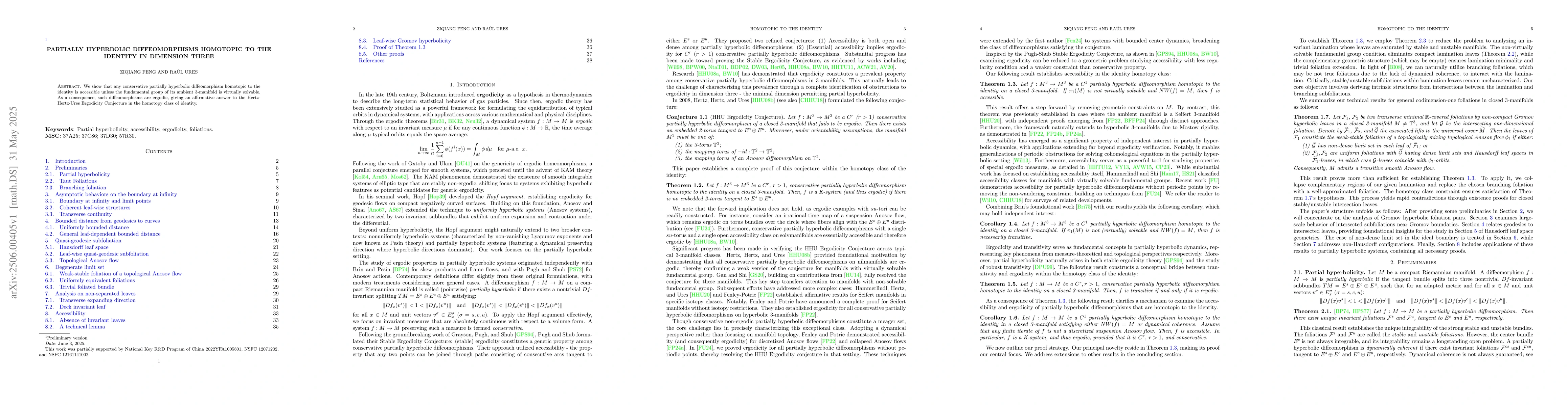 Establishment of accessibility conditions for partially hyperbolic diffeomorphisms and their ergodicity in dimension 3 under homotopy to the identity.