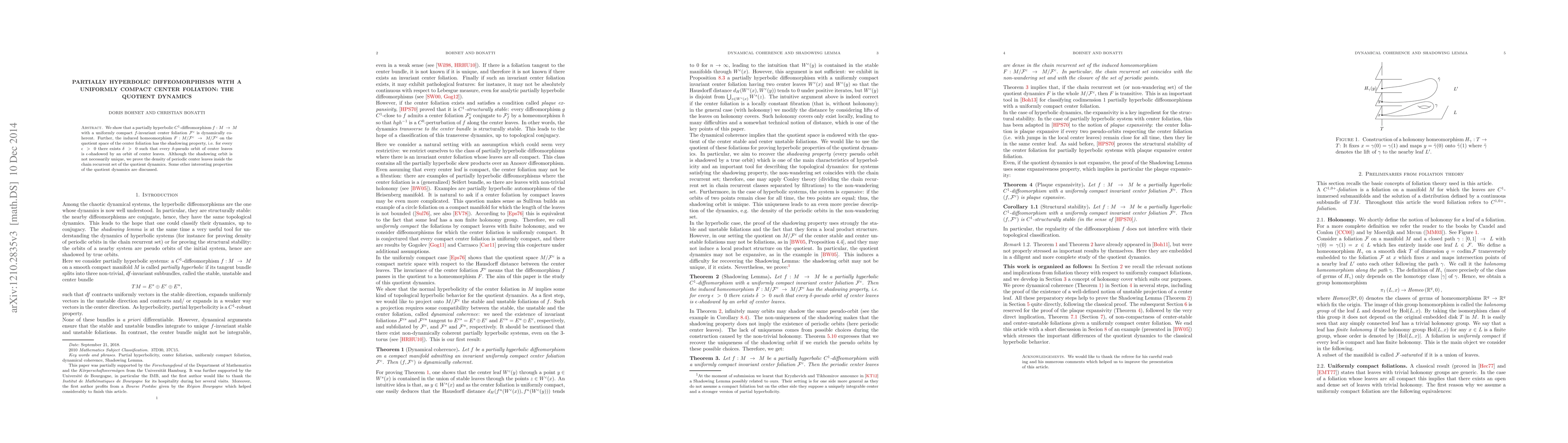 We show that a partially hyperbolic $C^1$ -diffeomorphism $f : M \to M$ with a uniformly compact $f$ -invariant center foliation $F^c$ is dynamically coherent. Further, the induced homeomorphism $F : M/F^c \to M/F^c$ on the quotient space of the center foliation has the shadowing property, i.e. for every $\varepsilon> 0$ there exists $\delta > 0$ such that every $\delta$-pseudo orbit of center leaves is $\varepsilon$-shadowed by an orbit of center leaves. Although the shadowing orbit is not necessarily unique, we prove the density of periodic center leaves inside the chain recurrent set of the quotient dynamics. Some other interesting properties of the quotient dynamics are discussed.
