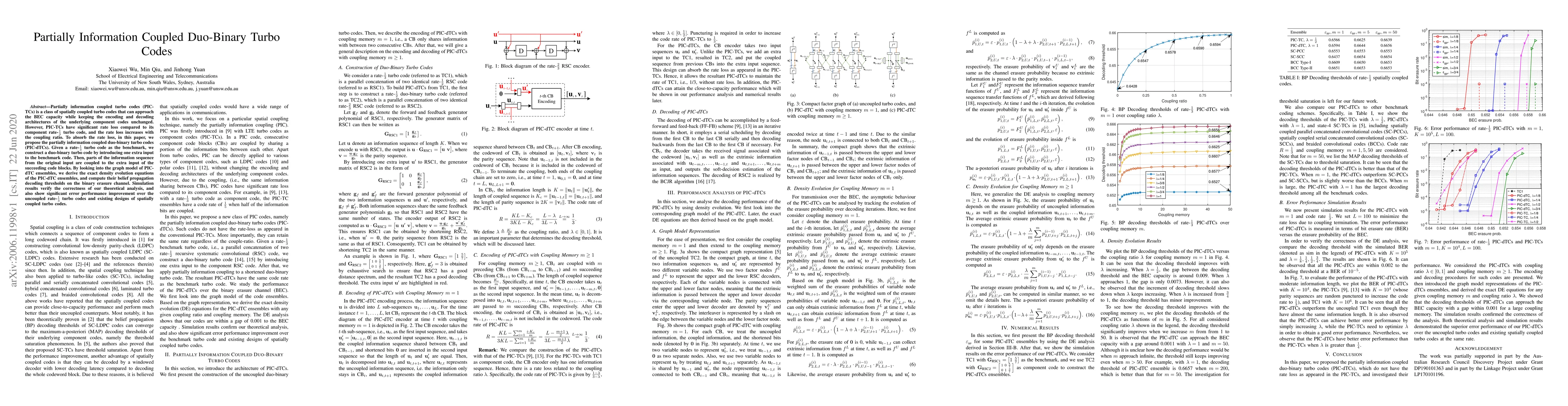 This paper proposes partially information coupled duo-binary turbo codes (PIC-dTCs) to mitigate rate loss in spatially coupled turbo codes. By introducing an extra input to a benchmark rate-1/3 turbo code, the authors achieve significant error performance improvement while maintaining the original encoding and decoding architectures.