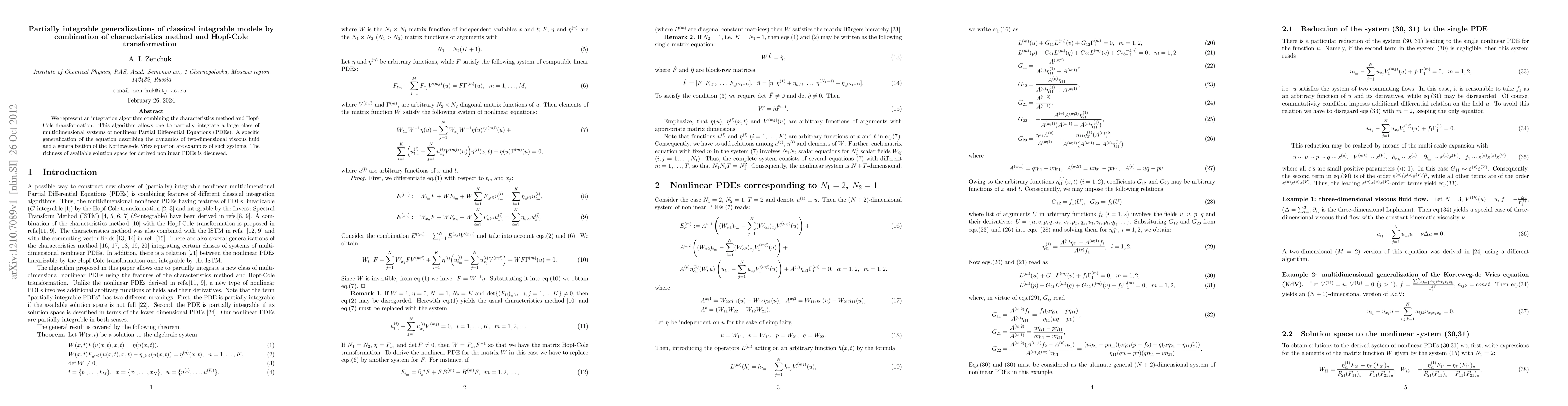 This paper presents an integration algorithm combining the characteristics method and Hopf-Cole transformation to partially integrate a wide range of multidimensional nonlinear PDEs. It applies this method to generalize equations for two-dimensional viscous fluid dynamics and the Korteweg-de Vries equation, discussing the resulting solution space.