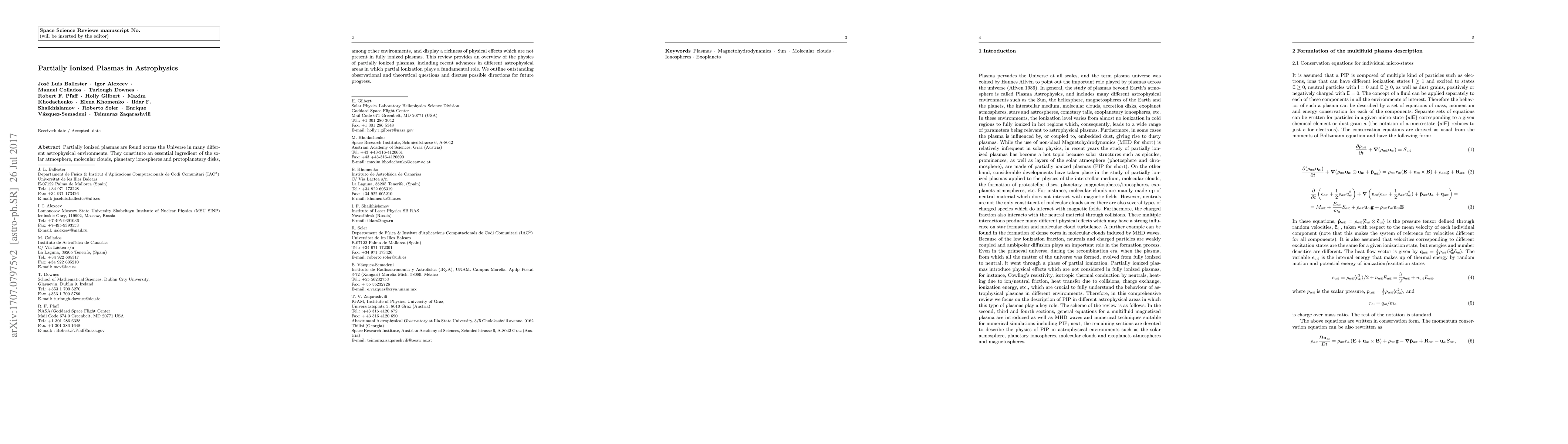 The paper provides a review of the physics of partially ionized plasmas in astrophysical environments, discussing recent advances and outstanding questions.
