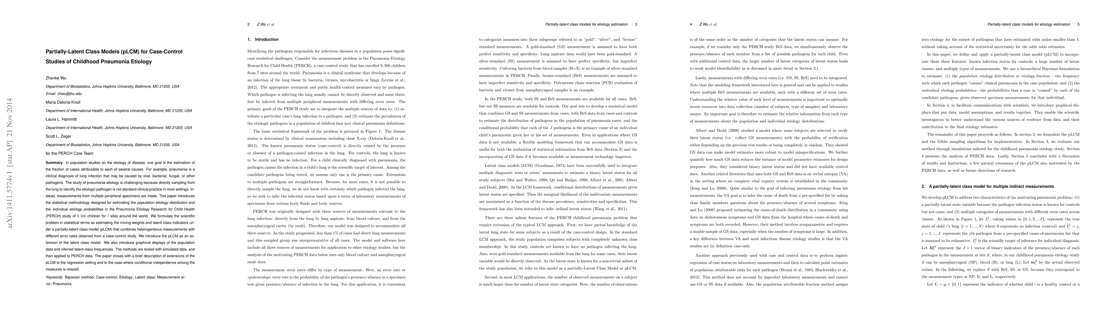 This paper introduces partially-latent class models (pLCM) to estimate the etiology distribution of childhood pneumonia using heterogeneous peripheral specimen data. The methodology is applied to the PERCH study data, demonstrating its effectiveness in estimating population and individual etiology probabilities.