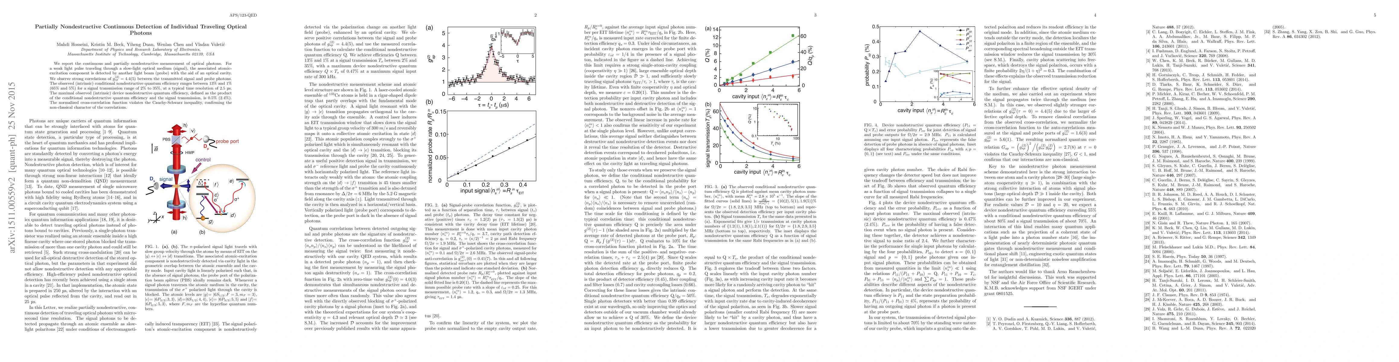 We report the continuous and partially nondestructive measurement of optical photons. For a weak light pulse traveling through a slow-light optical medium (signal), the associated atomic-excitation component is detected by another light beam (probe) with the aid of an optical cavity. We observe strong correlations of $g^{(2)}_{sp}=4.4(5)$ between the transmitted signal and probe photons. The observed (intrinsic) conditional nondestructive quantum efficiency ranges between 13% and 1% (65% and 5%) for a signal transmission range of 2% to 35%, at a typical time resolution of 2.5 $\mu$s. The maximal observed (intrinsic) device nondestructive quantum efficiency, defined as the product of the conditional nondestructive quantum efficiency and the signal transmission, is 0.5% (2.4%). The normalized cross-correlation function violates the Cauchy-Schwarz inequality, confirming the non-classical character of the correlations.