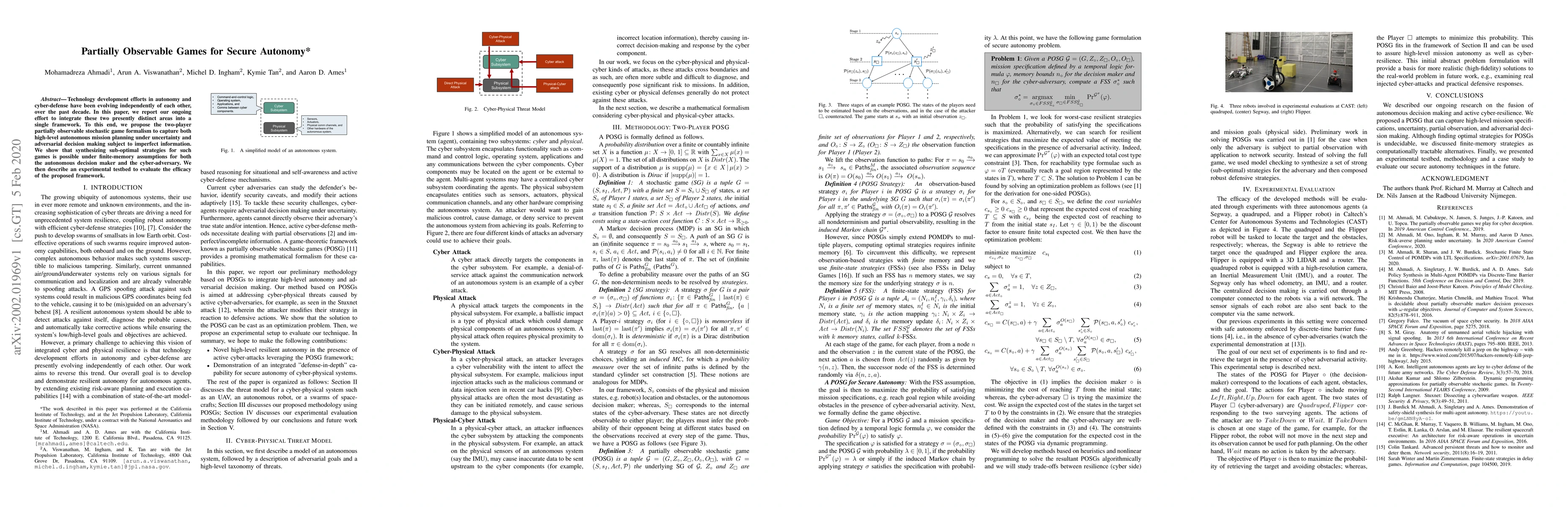 Technology development efforts in autonomy and cyber-defense have been evolving independently of each other, over the past decade. In this paper, we report our ongoing effort to integrate these two presently distinct areas into a single framework. To this end, we propose the two-player partially observable stochastic game formalism to capture both high-level autonomous mission planning under uncertainty and adversarial decision making subject to imperfect information. We show that synthesizing sub-optimal strategies for such games is possible under finite-memory assumptions for both the autonomous decision maker and the cyber-adversary. We then describe an experimental testbed to evaluate the efficacy of the proposed framework.