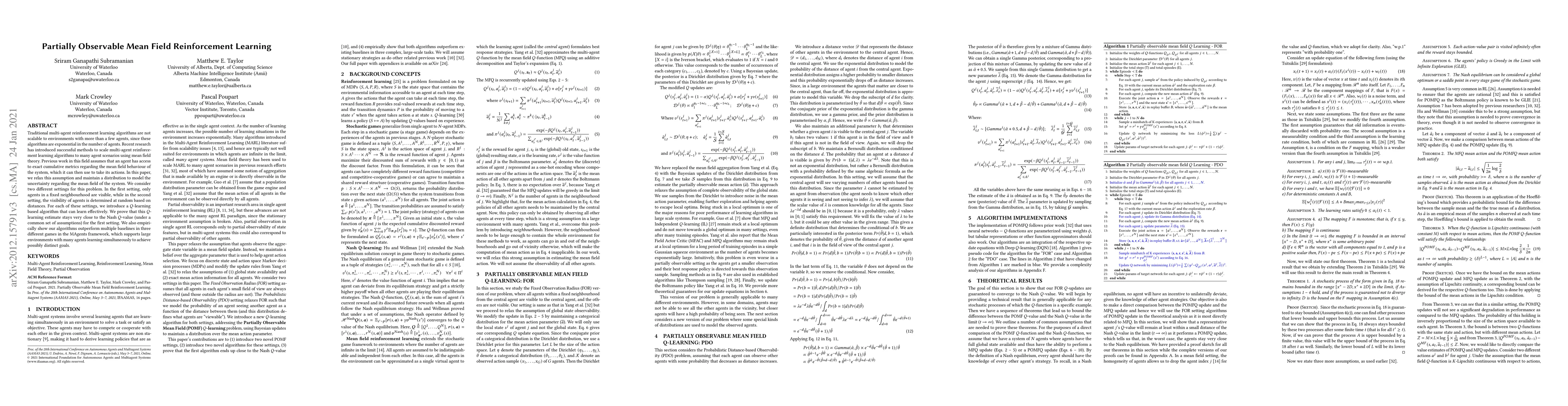 Traditional multi-agent reinforcement learning algorithms are not scalable to environments with more than a few agents, since these algorithms are exponential in the number of agents. Recent research has introduced successful methods to scale multi-agent reinforcement learning algorithms to many agent scenarios using mean field theory. Previous work in this field assumes that an agent has access to exact cumulative metrics regarding the mean field behaviour of the system, which it can then use to take its actions. In this paper, we relax this assumption and maintain a distribution to model the uncertainty regarding the mean field of the system. We consider two different settings for this problem. In the first setting, only agents in a fixed neighbourhood are visible, while in the second setting, the visibility of agents is determined at random based on distances. For each of these settings, we introduce a Q-learning based algorithm that can learn effectively. We prove that this Q-learning estimate stays very close to the Nash Q-value (under a common set of assumptions) for the first setting. We also empirically show our algorithms outperform multiple baselines in three different games in the MAgents framework, which supports large environments with many agents learning simultaneously to achieve possibly distinct goals.
