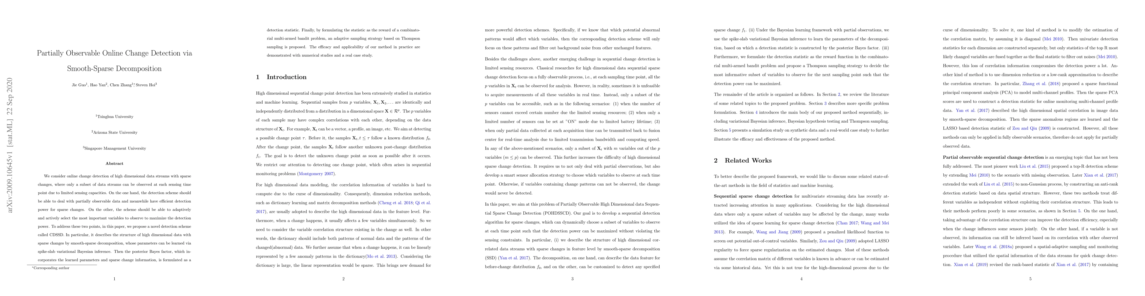 This paper proposes a novel online change detection scheme called CDSSD for high-dimensional data streams with sparse changes, utilizing smooth-sparse decomposition and spike-slab variational Bayesian inference. The method adaptively selects important variables to observe using Thompson sampling based on a combinatorial multi-armed bandit problem.