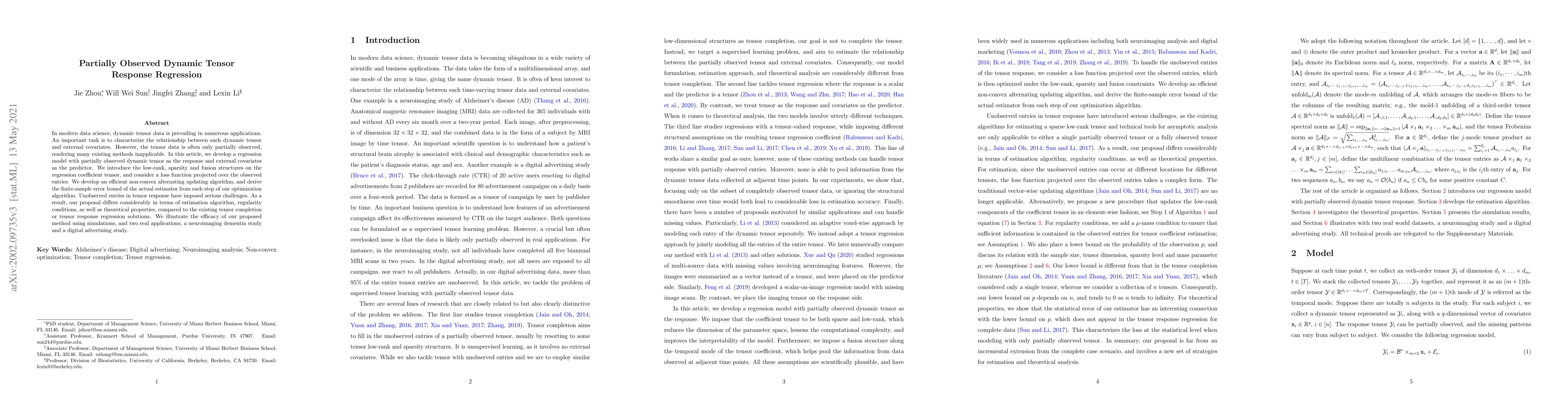 This paper proposes a regression model for partially observed dynamic tensors, introducing low-rank, sparsity, and fusion structures on the regression coefficient tensor. The authors develop an efficient non-convex algorithm and provide finite-sample error bounds, demonstrating the method's effectiveness through simulations and real-world applications in neuroimaging and digital advertising.