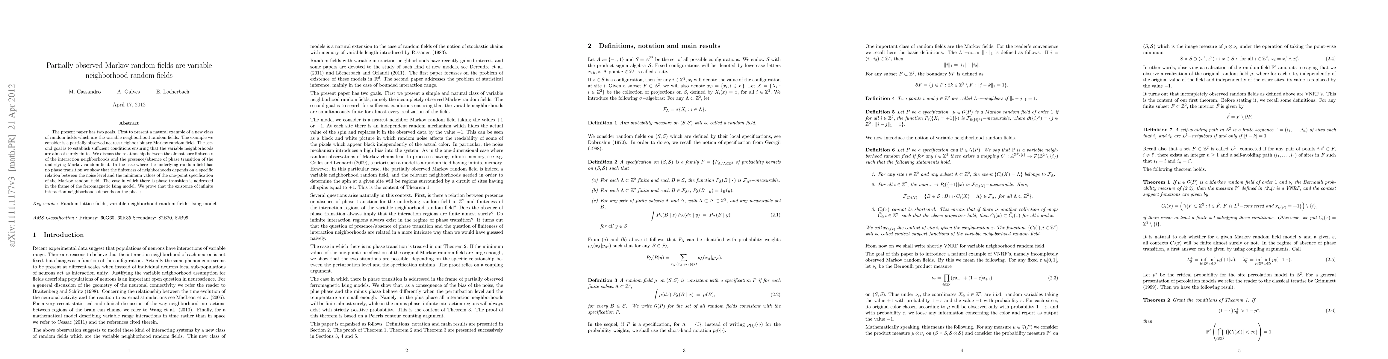 Summary: This paper introduces a class of variable neighborhood random fields exemplified by partially observed nearest neighbor binary Markov random fields. It establishes conditions for ensuring these neighborhoods are almost surely finite and explores their relationship with phase transitions in the underlying Markov random field, particularly in the context of the ferromagnetic Ising model.