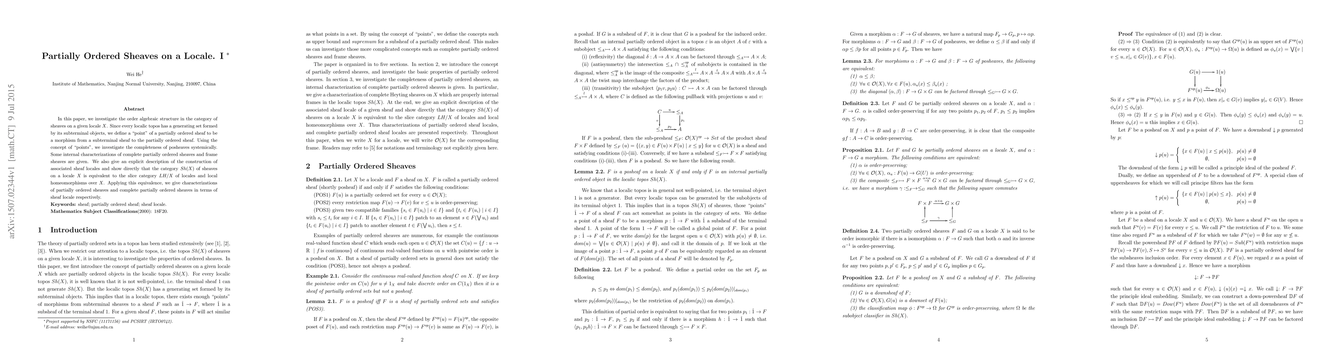 This paper explores the order algebraic structure within the category of sheaves on a locale, defining "points" of partially ordered sheaves as morphisms from subterminal sheaves. It investigates the completeness of these sheaves and provides internal characterizations of complete and frame sheaves, establishing an equivalence between the category of sheaves on a locale and the slice category of locales over it. The paper also introduces directed complete partially ordered sheaves and provides their characterizations.