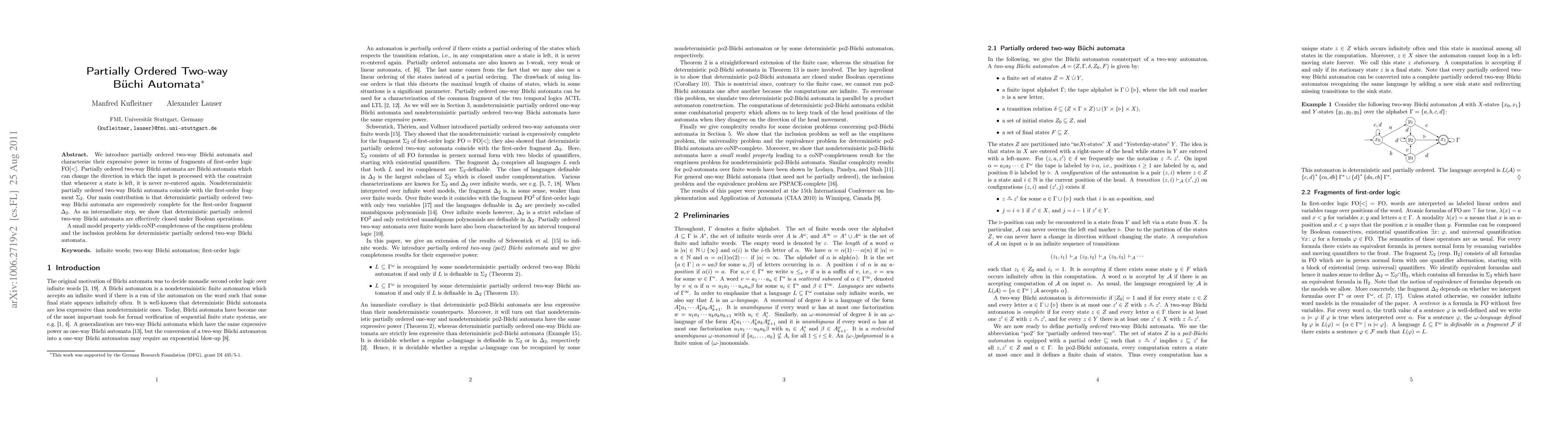 This paper introduces partially ordered two-way Büchi automata, exploring their expressive power through first-order logic fragments, specifically showing that deterministic versions capture the Δ₂ fragment. It also proves coNP-completeness for their emptiness and inclusion problems.