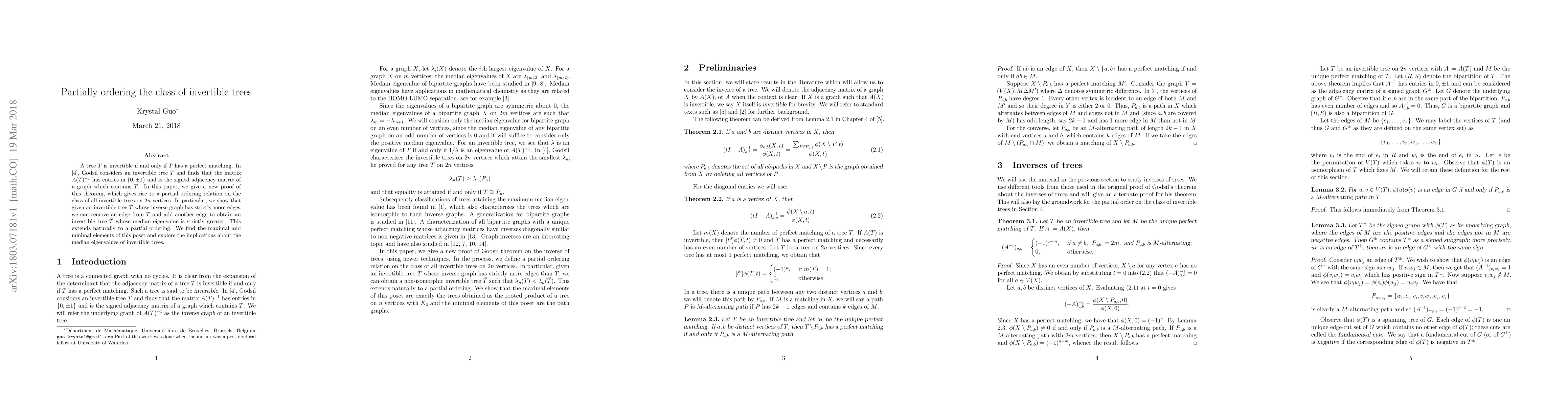 A tree T is invertible if and only if T has a perfect matching. Godsil considers an invertible tree T and finds that the inverse of the adjacency matrix of T has entries in {0, 1, -1} and is the signed adjacency matrix of a graph which contains T. In this paper, we give a new proof of this theorem, which gives rise to a partial ordering relation on the class of all invertible trees on 2n vertices. In particular, we show that given an invertible tree T whose inverse graph has strictly more edges, we can remove an edge from T and add another edge to obtain an invertible tree T' whose median eigenvalue is strictly greater. This extends naturally to a partial ordering. We characterize the maximal and minimal elements of this poset and explore the implications about the median eigenvalues of invertible trees.