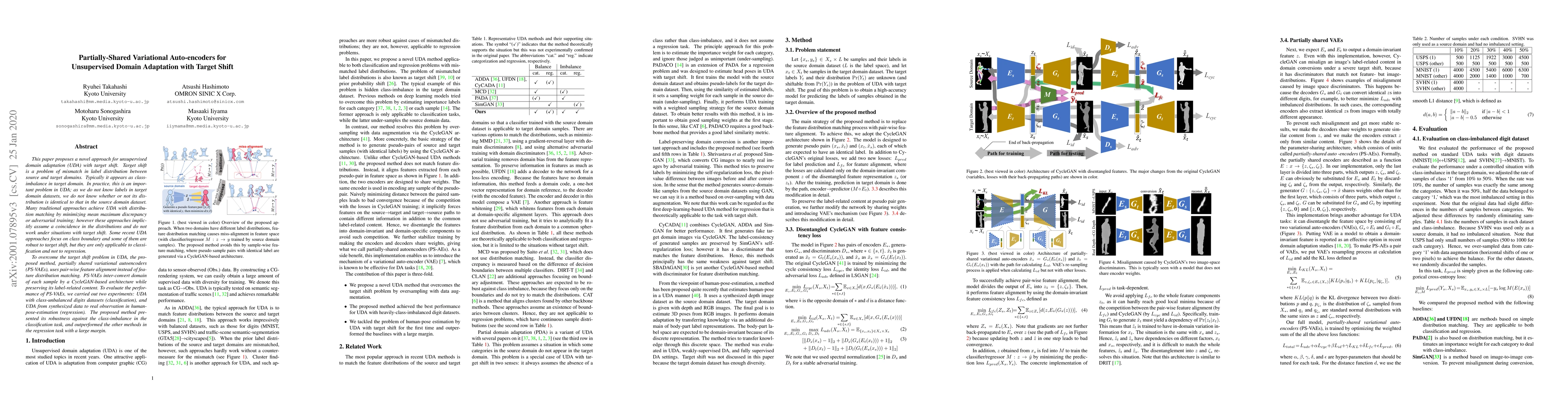 This paper proposes a novel approach for unsupervised domain adaptation (UDA) with target shift. Target shift is a problem of mismatch in label distribution between source and target domains. Typically it appears as class-imbalance in target domain. In practice, this is an important problem in UDA; as we do not know labels in target domain datasets, we do not know whether or not its distribution is identical to that in the source domain dataset. Many traditional approaches achieve UDA with distribution matching by minimizing mean maximum discrepancy or adversarial training; however these approaches implicitly assume a coincidence in the distributions and do not work under situations with target shift. Some recent UDA approaches focus on class boundary and some of them are robust to target shift, but they are only applicable to classification and not to regression. To overcome the target shift problem in UDA, the proposed method, partially shared variational autoencoders (PS-VAEs), uses pair-wise feature alignment instead of feature distribution matching. PS-VAEs inter-convert domain of each sample by a CycleGAN-based architecture while preserving its label-related content. To evaluate the performance of PS-VAEs, we carried out two experiments: UDA with class-unbalanced digits datasets (classification), and UDA from synthesized data to real observation in human-pose-estimation (regression). The proposed method presented its robustness against the class-imbalance in the classification task, and outperformed the other methods in the regression task with a large margin.