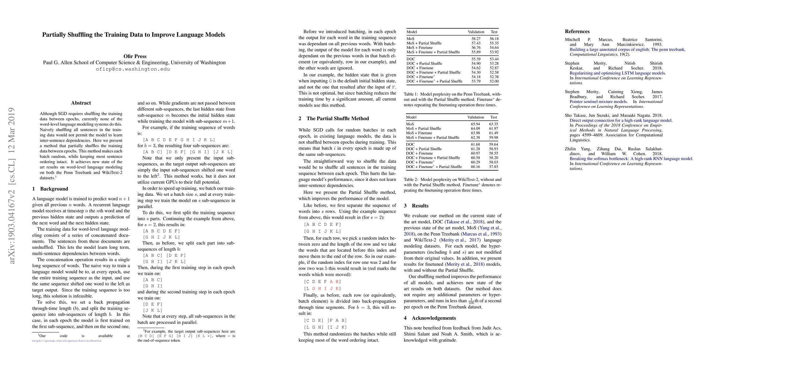 This paper introduces a method of partially shuffling training data in word-level language modeling, maintaining sentence order while ensuring each batch is random. This approach achieves superior results on Penn Treebank and WikiText-2 datasets, outperforming existing systems.