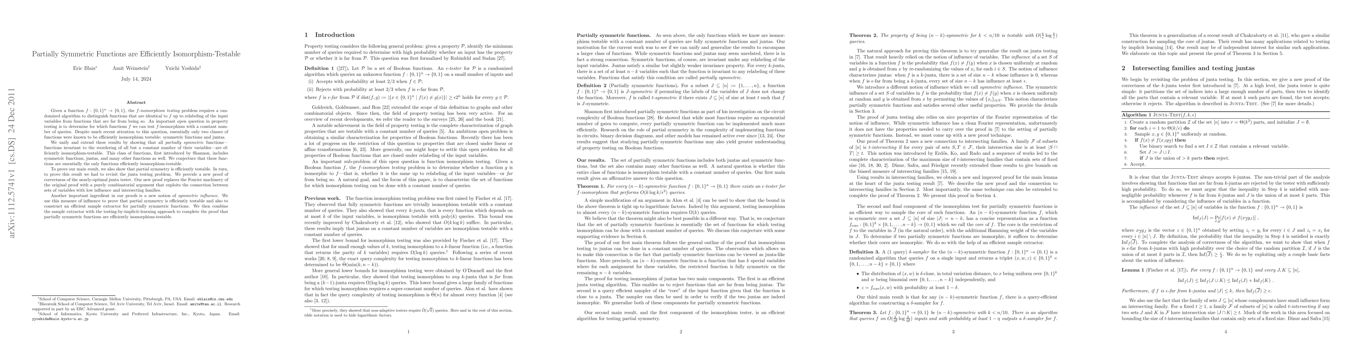 Given a function f: {0,1}^n \to {0,1}, the f-isomorphism testing problem requires a randomized algorithm to distinguish functions that are identical to f up to relabeling of the input variables from functions that are far from being so. An important open question in property testing is to determine for which functions f we can test f-isomorphism with a constant number of queries. Despite much recent attention to this question, essentially only two classes of functions were known to be efficiently isomorphism testable: symmetric functions and juntas. We unify and extend these results by showing that all partially symmetric functions---functions invariant to the reordering of all but a constant number of their variables---are efficiently isomorphism-testable. This class of functions, first introduced by Shannon, includes symmetric functions, juntas, and many other functions as well. We conjecture that these functions are essentially the only functions efficiently isomorphism-testable. To prove our main result, we also show that partial symmetry is efficiently testable. In turn, to prove this result we had to revisit the junta testing problem. We provide a new proof of correctness of the nearly-optimal junta tester. Our new proof replaces the Fourier machinery of the original proof with a purely combinatorial argument that exploits the connection between sets of variables with low influence and intersecting families. Another important ingredient in our proofs is a new notion of symmetric influence. We use this measure of influence to prove that partial symmetry is efficiently testable and also to construct an efficient sample extractor for partially symmetric functions. We then combine the sample extractor with the testing-by-implicit-learning approach to complete the proof that partially symmetric functions are efficiently isomorphism-testable.