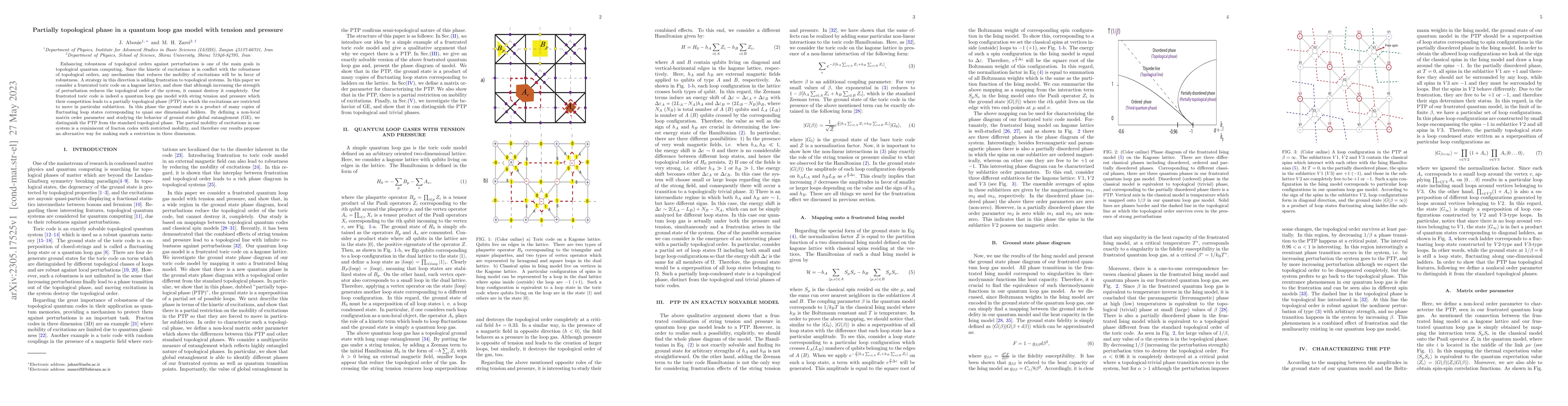 This paper investigates a frustrated toric code on a kagome lattice, demonstrating that despite perturbations, the system maintains a partially topological phase (PTP) by restricting the mobility of excitations. The authors show that this PTP arises from the competition between string tension and pressure in a quantum loop gas model, leading to a quasi one-dimensional behavior and distinguishing it from standard topological phases through non-local matrix order parameters and global entanglement analysis.