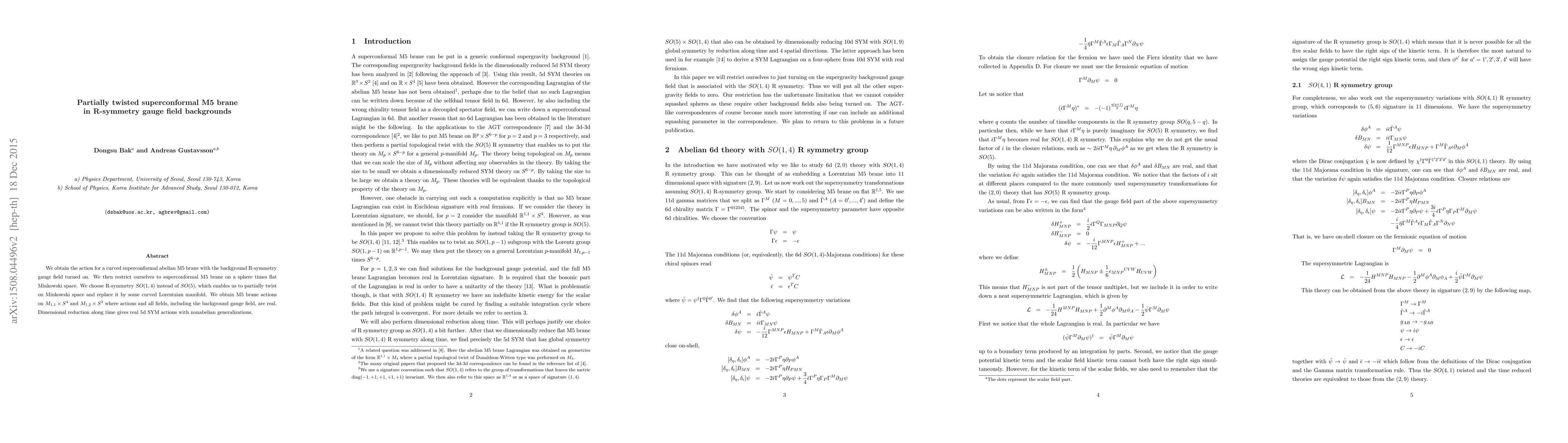 We obtain the action for a curved superconformal abelian M5 brane with the background R-symmetry gauge field turned on. We then restrict ourselves to superconformal M5 brane on a sphere times flat Minkowski space. We choose R-symmetry SO(1,4) instead of SO(5), which enables us to partially twist on Minkowski space and replace it by some curved Lorentzian manifold. We obtain M5 brane actions on $M_{1,1} \times S^4$ and $M_{1,2} \times S^3$ where actions and all fields, including the background gauge field, are real. Dimensional reduction along time gives real 5d SYM actions with nonabelian generalizations.