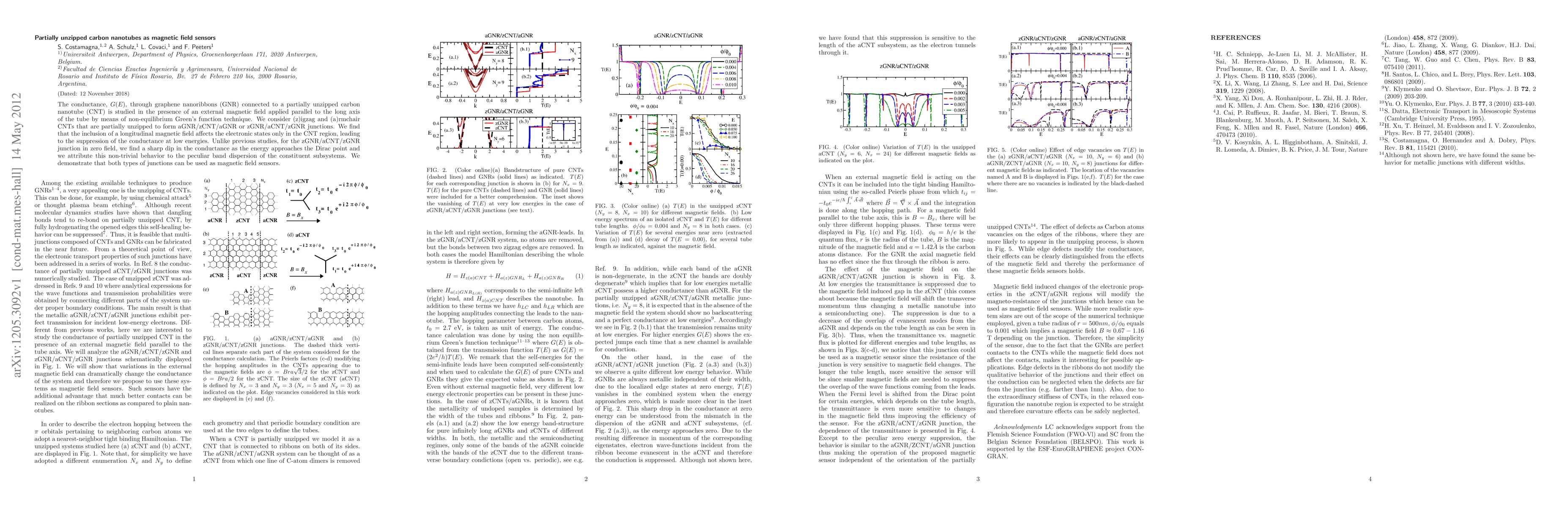 The conductance, $G(E)$, through graphene nanoribbons (GNR) connected to a partially unzipped carbon nanotube (CNT) is studied in the presence of an external magnetic field applied parallel to the long axis of the tube by means of non-equilibrium Green's function technique. We consider (z)igzag and (a)rmchair CNTs that are partially unzipped to form aGNR/zCNT/aGNR or zGNR/aCNT/zGNR junctions. We find that the inclusion of a longitudinal magnetic field affects the electronic states only in the CNT region, leading to the suppression of the conductance at low energies. Unlike previous studies, for the zGNR/aCNT/zGNR junction in zero field, we find a sharp dip in the conductance as the energy approaches the Dirac point and we attribute this non-trivial behavior to the peculiar band dispersion of the constituent subsystems. We demonstrate that both types of junctions can be used as magnetic field sensors.