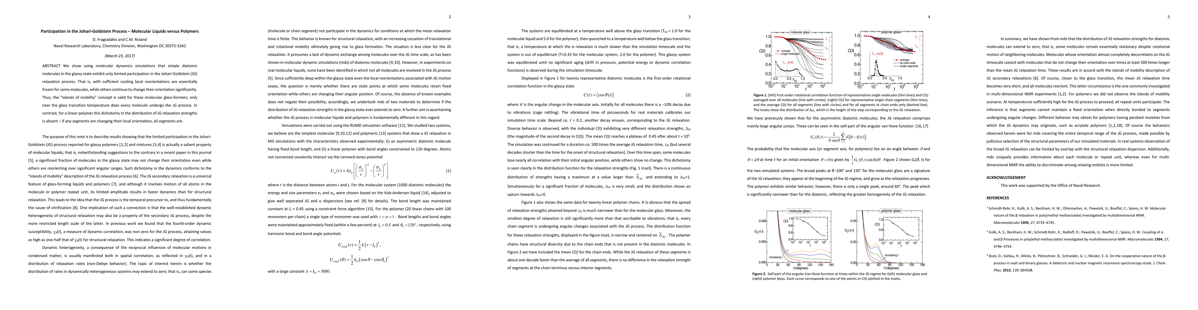 This paper uses molecular dynamics simulations to show that simple diatomic molecules in the glassy state exhibit limited participation in the Johari-Goldstein relaxation process, with some molecules freezing their local reorientations while others remain mobile. In contrast, linear polymers show uniform participation in the JG process regardless of local orientation changes.