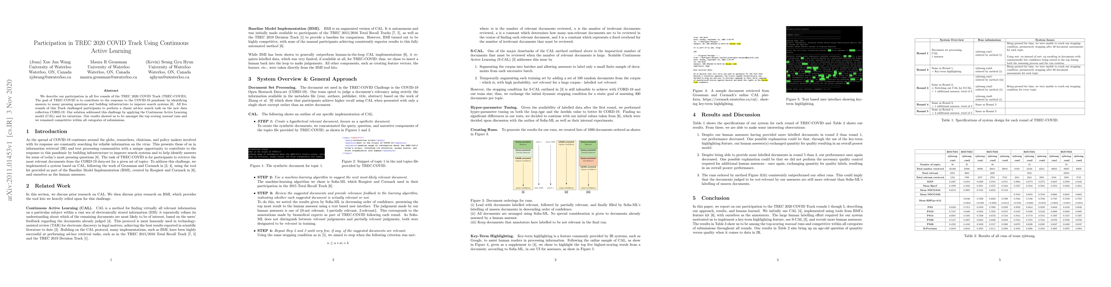 This paper details a team's participation in the TREC 2020 COVID Track using Continuous Active Learning (CAL) across five rounds, achieving top scores in manual runs by leveraging the CORD-19 dataset to improve search systems for COVID-19 information.