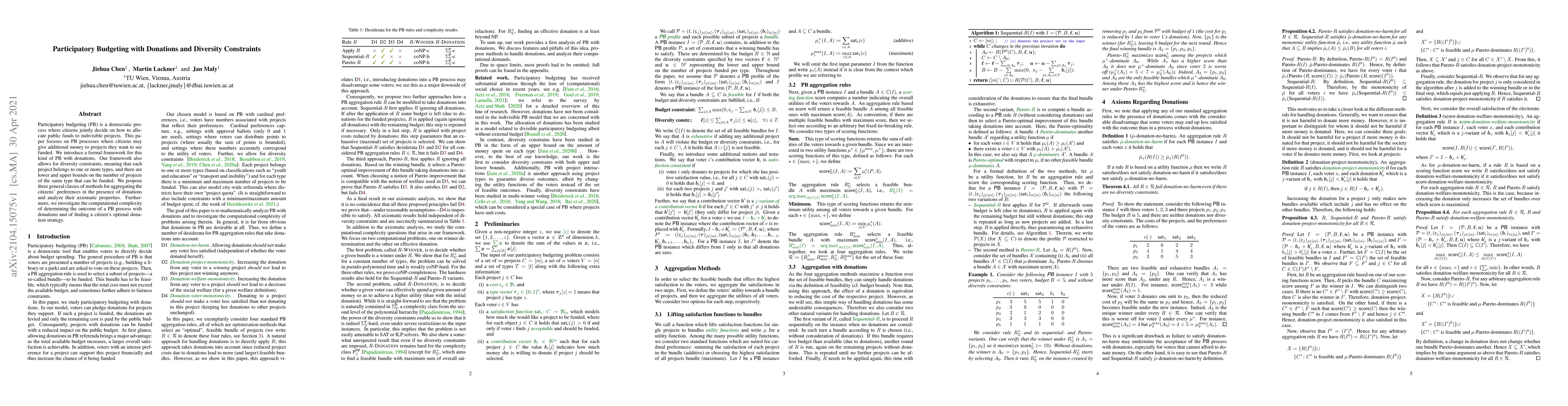 Participatory budgeting (PB) is a democratic process where citizens jointly decide on how to allocate public funds to indivisible projects. This paper focuses on PB processes where citizens may give additional money to projects they want to see funded. We introduce a formal framework for this kind of PB with donations. Our framework also allows for diversity constraints, meaning that each project belongs to one or more types, and there are lower and upper bounds on the number of projects of the same type that can be funded. We propose three general classes of methods for aggregating the citizens' preferences in the presence of donations and analyze their axiomatic properties. Furthermore, we investigate the computational complexity of determining the outcome of a PB process with donations and of finding a citizen's optimal donation strategy.
