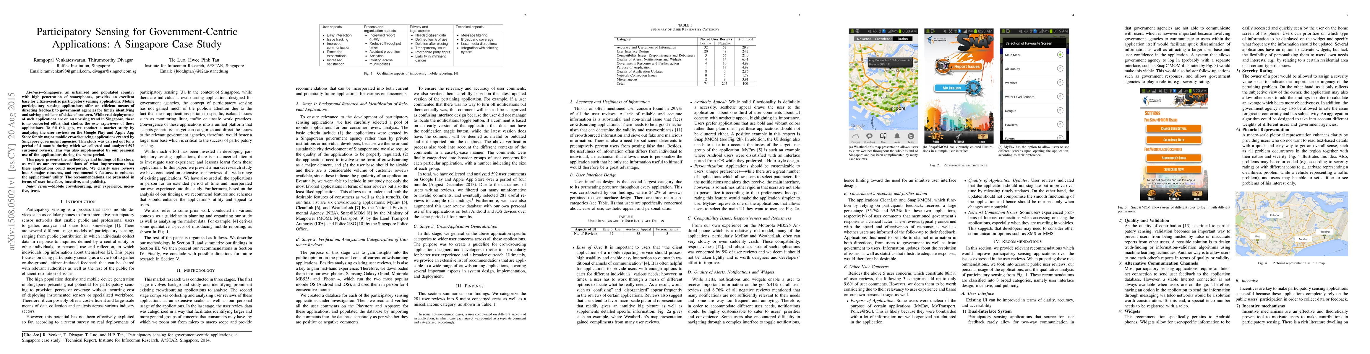 Singapore, an urbanized and populated country with high penetration of smartphones, provides an excellent base for citizen-centric participatory sensing applications. Mobile participatory sensing applications offer an efficient means of directing feedback to government agencies for timely identifying and solving problems of citizens' concern. While real deployments of such applications are on an uprising trend in Singapore, there is no concerted effort that studies the {\em user experience} of these applications. To fill this gap, we conduct a market study by analyzing the user reviews on the Google Play and Apple App Store for six major mobile crowdsourcing applications created by Singapore government agencies. This study was carried out for a period of 4 months during which we collected and analyzed 592 customer reviews. This was also supplemented by our personal use of the applications during the same period. This paper presents the methodology and findings of this study, as well as our recommendations of what improvements that these applications could incorporate. We classify user reviews into 8 major concerns, and recommend 9 features to enhance the applications' utility. The recommendations are presented in terms of user interface, incentive, and publicity.