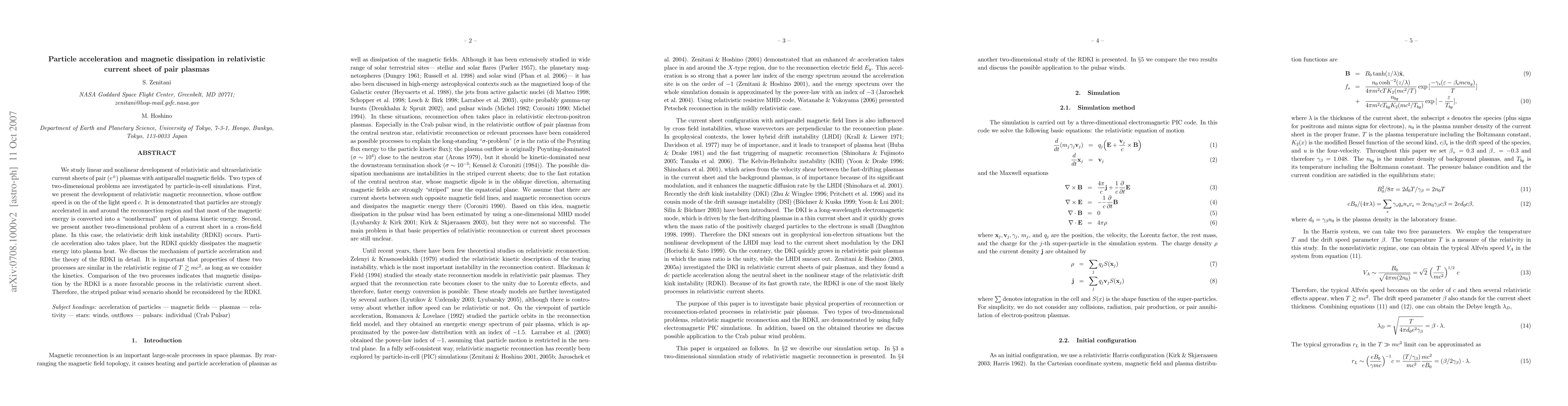We study linear and nonlinear development of relativistic and ultrarelativistic current sheets of pair plasmas with antiparallel magnetic fields. Two types of two-dimensional problems are investigated by particle-in-cell simulations. First, we present the development of relativistic magnetic reconnection, whose outflow speed is an order of the light speed c. It is demonstrated that particles are strongly accelerated in and around the reconnection region, and that most of magnetic energy is converted into "nonthermal" part of plasma kinetic energy. Second, we present another two-dimensional problem of a current sheet in a cross-field plane. In this case, the relativistic drift kink instability (RDKI) occurs. Particle acceleration also takes place, but the RDKI fast dissipates the magnetic energy into plasma heat. We discuss the mechanism of particle acceleration and the theory of the RDKI in detail. It is important that properties of these two processes are similar in the relativistic regime of T > mc^2, as long as we consider the kinetics. Comparison of the two processes indicates that magnetic dissipation by the RDKI is more favorable process in the relativistic current sheet. Therefore the striped pulsar wind scenario should be reconsidered by the RDKI.