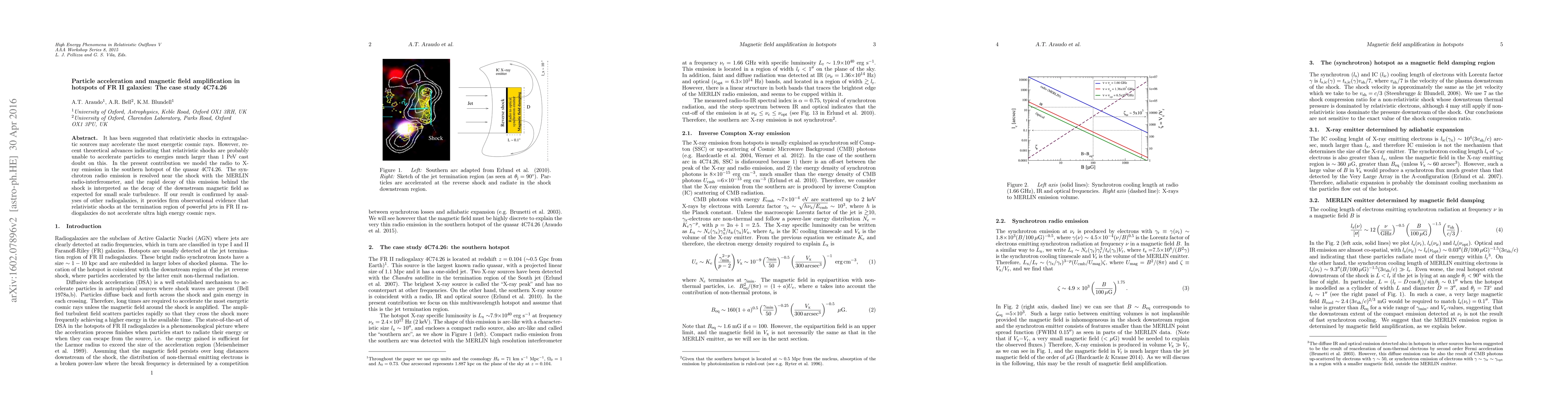 This paper models the radio to X-ray emission in the southern hotspot of quasar 4C74.26, finding that relativistic shocks likely do not accelerate ultra-high energy cosmic rays, as the downstream magnetic field decays rapidly.