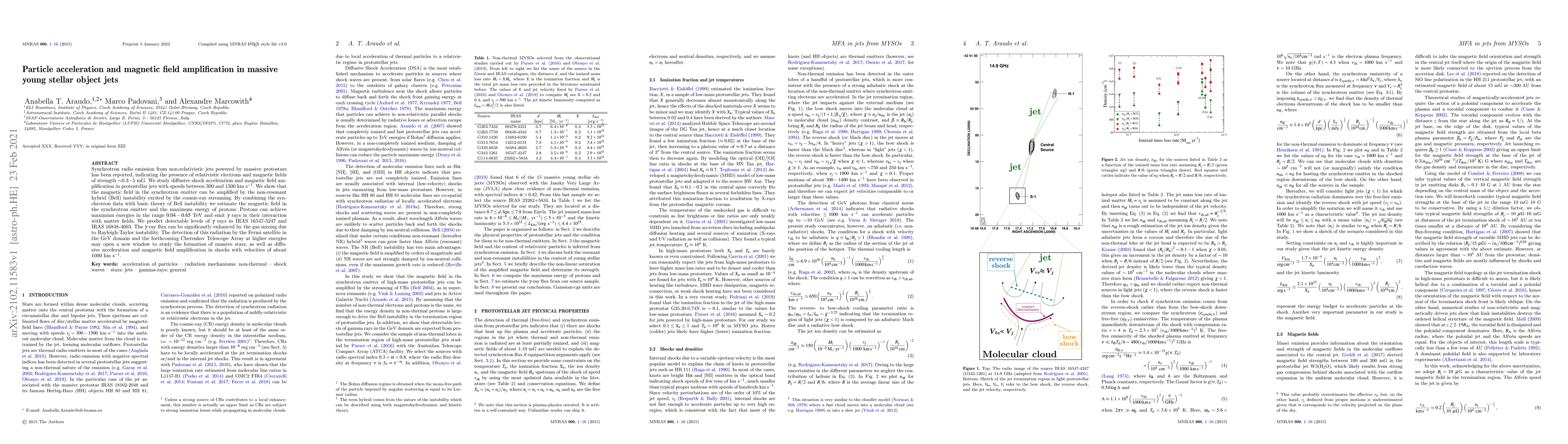This paper investigates the mechanisms of particle acceleration and magnetic field amplification in jets from massive young stellar objects. It demonstrates that the non-resonant hybrid instability can amplify magnetic fields, leading to protons achieving energies up to 0.65 TeV and emitting detectable gamma rays, potentially observable by the Fermi satellite and Cherenkov Telescope Array.