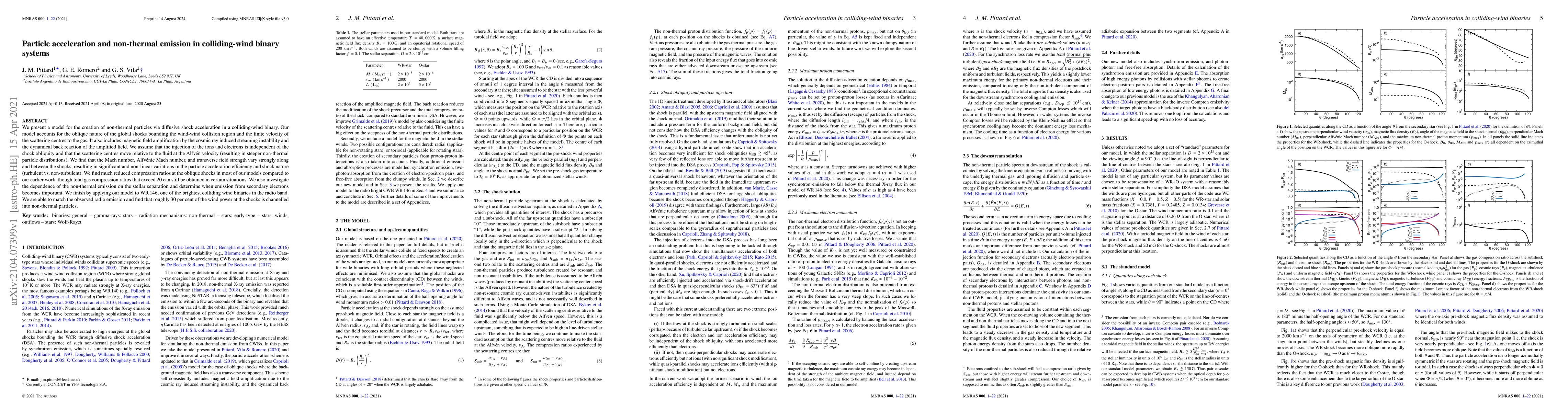 This paper models particle acceleration and non-thermal emission in colliding-wind binaries, considering shock obliquity and magnetic field amplification. It finds significant variations in acceleration efficiency and identifies conditions that lead to high compression ratios and important secondary electron emission.