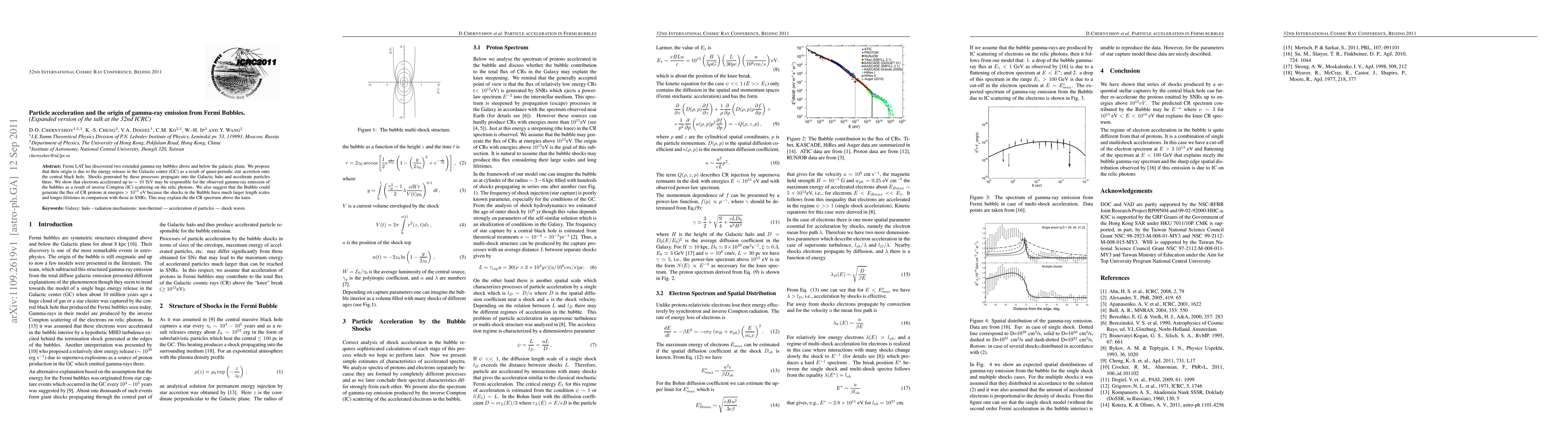 The Fermi LAT detected gamma-ray bubbles above and below the galactic plane, likely formed by quasi-periodic star accretion onto the central black hole. Particles accelerated by these shocks in the Galactic halo up to ~10 TeV may produce the observed gamma-ray emission via inverse Compton scattering. Additionally, the Fermi Bubbles could generate ultra-high-energy cosmic rays, explaining the spectrum above the knee.