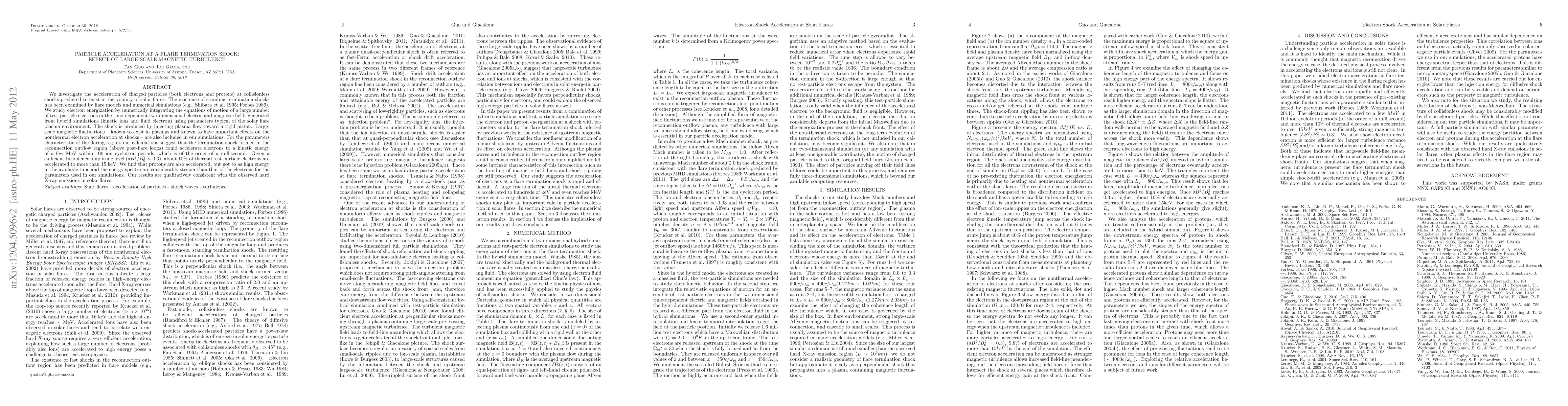 This paper investigates the acceleration of charged particles at solar flare termination shocks, focusing on the role of large-scale magnetic turbulence. Simulations show that the shock can accelerate electrons to MeV energies within milliseconds, with turbulence aiding in energizing about 10% of thermal electrons to over 15 keV, while protons are less efficiently accelerated.
