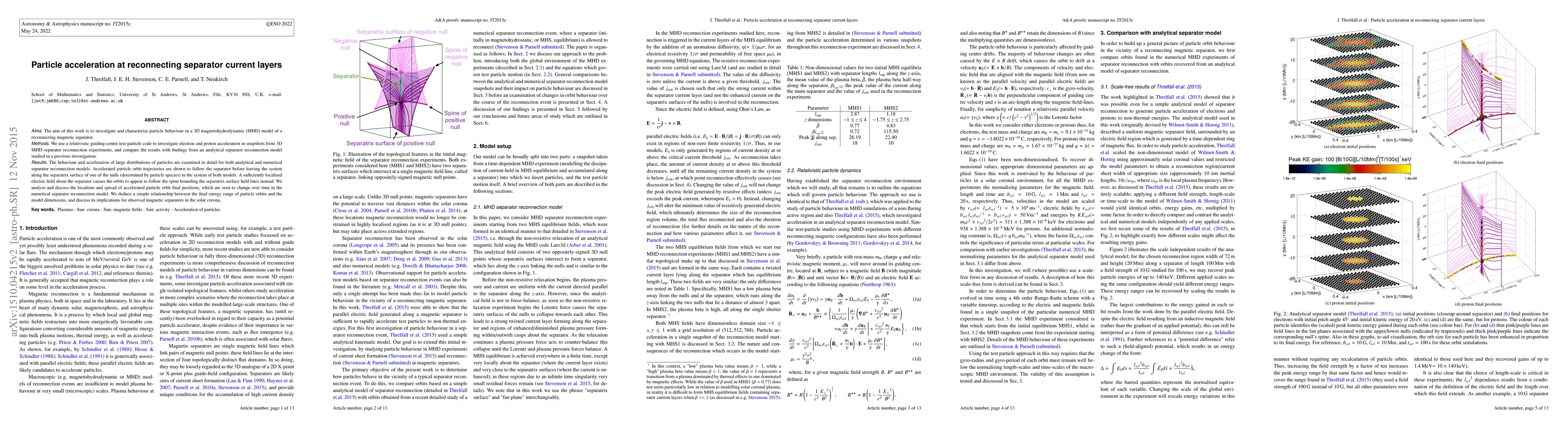 This paper investigates electron and proton acceleration in 3D MHD models of magnetic separator reconnection, comparing numerical results with analytical models. The study finds that particles follow the separator and are accelerated by localised electric fields, with final energy ranges related to the model dimensions, offering insights into solar corona magnetic separators.