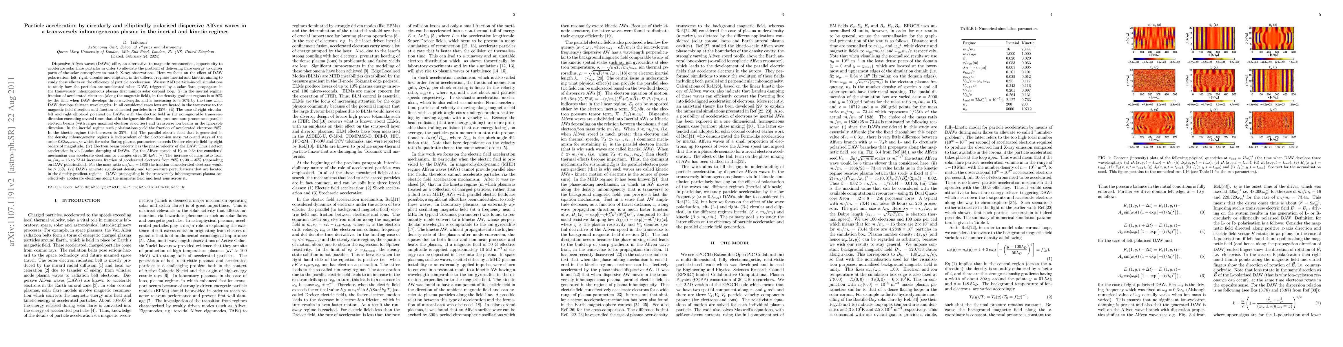 This paper explores the acceleration of solar flare particles via dispersive Alfven waves (DAWs) in a transversely inhomogeneous plasma, using 2.5D PIC simulations. It finds that DAWs with different polarisations (circular and elliptical) can significantly enhance electron and ion heating, with electrons accelerated to energies up to ~20 keV in the inertial regime, and up to ~35% in the kinetic regime.