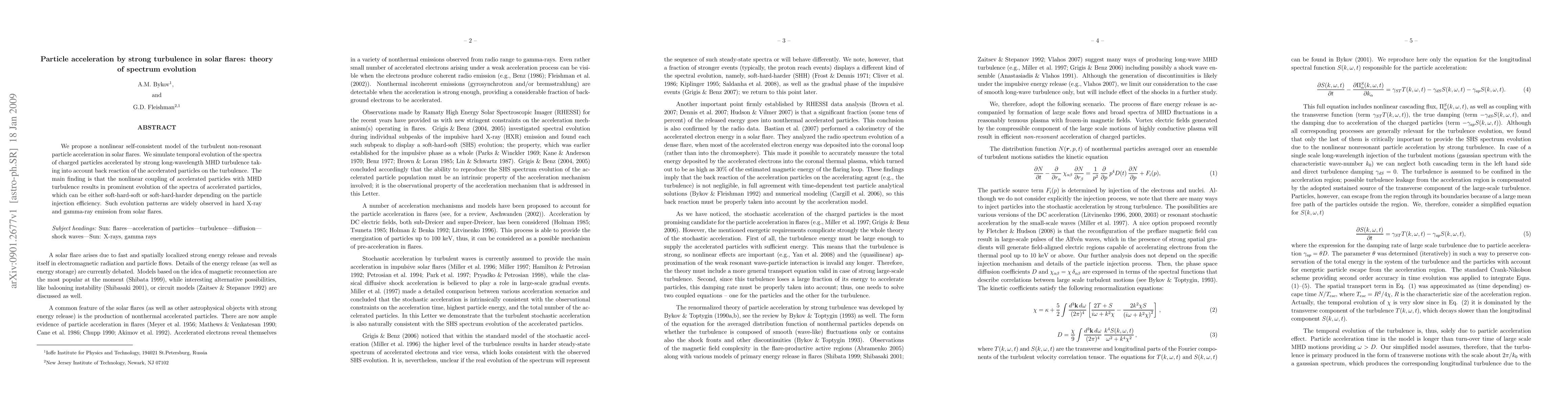 This paper proposes a model for particle acceleration in solar flares driven by strong turbulence, showing that the interaction between accelerated particles and magnetohydrodynamic (MHD) turbulence leads to evolving particle spectra patterns, which correlate with observed hard X-ray and gamma-ray emissions. The model accounts for the back reaction of accelerated particles on the turbulence, predicting either soft-hard-soft or soft-hard-harder spectral evolution.