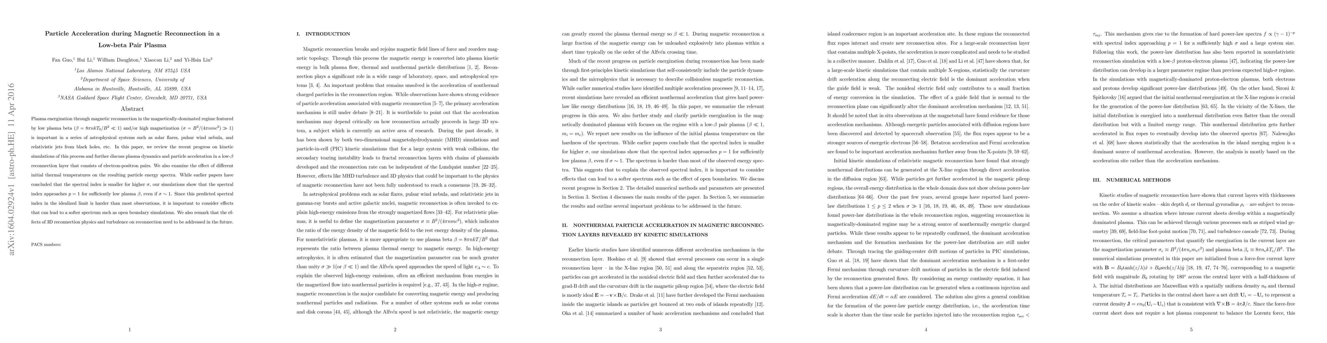This paper reviews kinetic simulations of magnetic reconnection in low-beta pair plasmas, finding that particle acceleration leads to a spectral index approaching $p=1$ under certain conditions. It highlights the need to consider open boundary effects and 3D physics for more realistic particle energy spectra.