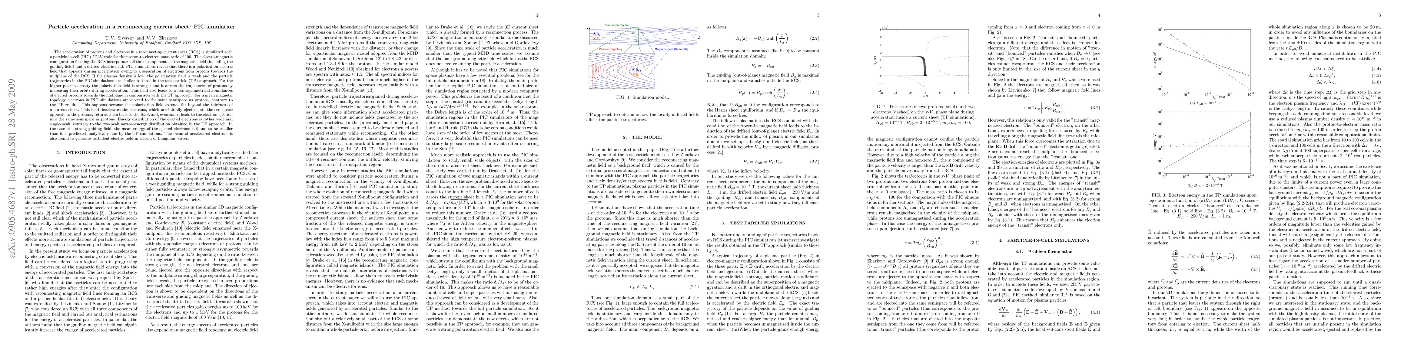 This paper uses PIC simulations to study particle acceleration in a reconnecting current sheet, revealing that a polarisation electric field emerges due to electron-proton separation, affecting particle trajectories and ejection patterns, especially in high-density plasmas. Electrons are eventually ejected into the same semispace as protons due to the extended polarisation field, contrary to test particle approach predictions.