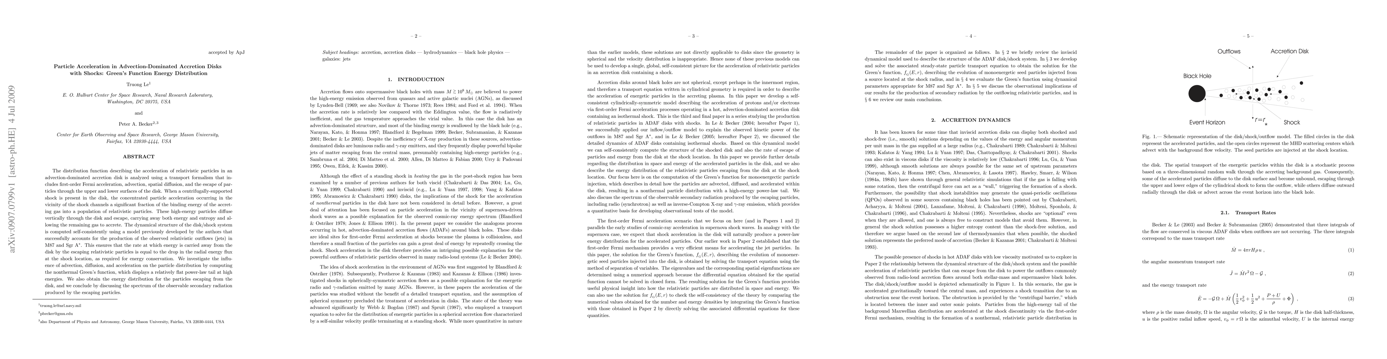 This paper analyzes the acceleration of relativistic particles in advection-dominated accretion disks with shocks using a transport formalism. It finds that shocks in the disk channel a significant fraction of the gas's binding energy into relativistic particles, which diffuse and escape, carrying energy and entropy away, thus conserving energy.