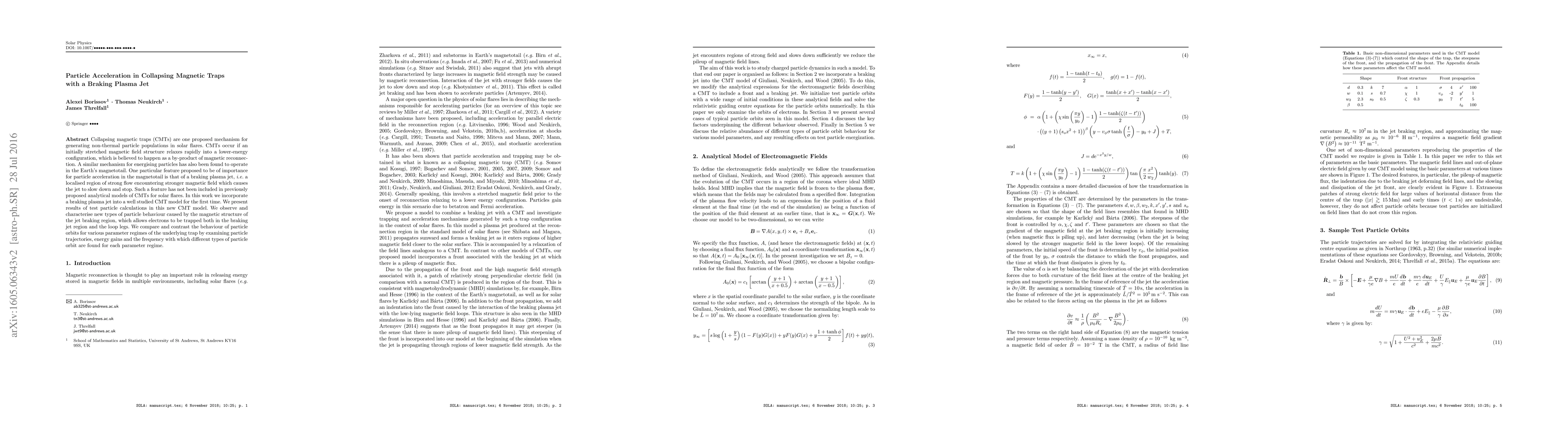 Collapsing magnetic traps (CMTs) are one proposed mechanism for generating non-thermal particle populations in solar flares. CMTs occur if an initially stretched magnetic field structure relaxes rapidly into a lower-energy configuration, which is believed to happen as a by-product of magnetic reconnection. A similar mechanism for energising particles has also been found to operate in the Earth's magnetotail. One particular feature proposed to be of importance for particle acceleration in the magnetotail is that of a braking plasma jet, i.e. a localised region of strong flow encountering stronger magnetic field which causes the jet to slow down and stop. Such a feature has not been included in previously proposed analytical models of CMTs for solar flares. In this work we incorporate a braking plasma jet into a well studied CMT model for the first time. We present results of test particle calculations in this new CMT model. We observe and characterise new types of particle behaviour caused by the magnetic structure of the jet braking region, which allows electrons to be trapped both in the braking jet region and the loop legs. We compare and contrast the behaviour of particle orbits for various parameter regimes of the underlying trap by examining particle trajectories, energy gains and the frequency with which different types of particle orbit are found for each parameter regime.