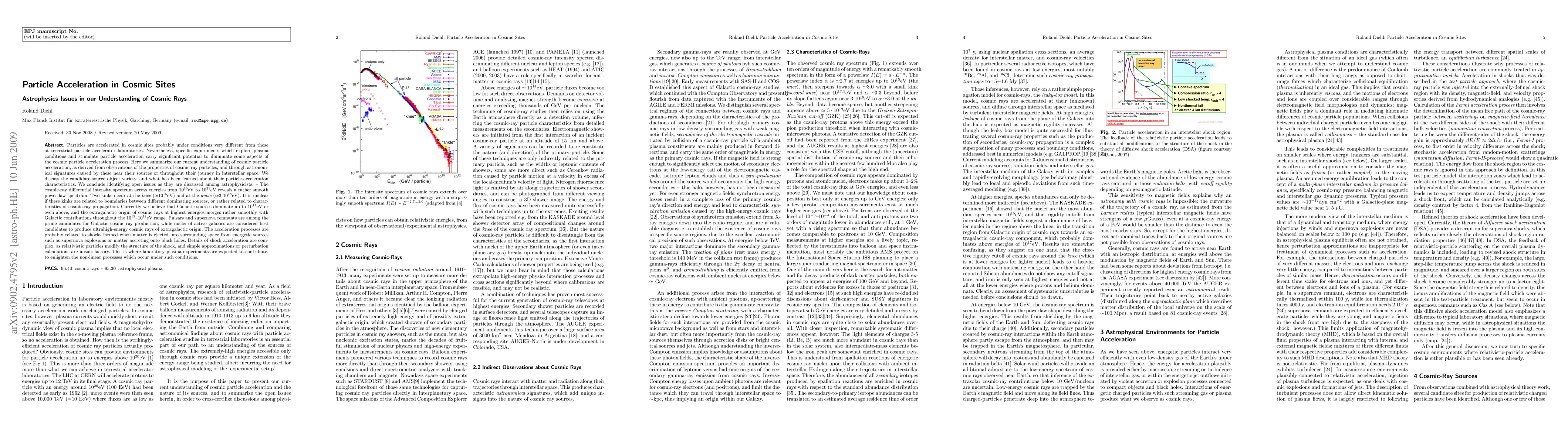 Laboratory experiments to explore plasma conditions and stimulated particle acceleration can illuminate aspects of the cosmic particle acceleration process. Here we discuss the cosmic-ray candidate source object variety, and what has been learned about their particle-acceleration characteristics. We identify open issues as discussed among astrophysicists. -- The cosmic ray differential intensity spectrum is a rather smooth power-law spectrum, with two kinks at the "knee" (~10^15 eV) and at the "ankle" (~3 10^18 eV). It is unclear if these kinks are related to boundaries between different dominating sources, or rather related to characteristics of cosmic-ray propagation. We believe that Galactic sources dominate up to 10^17 eV or even above, and the extragalactic origin of cosmic rays at highest energies merges rather smoothly with Galactic contributions throughout the 10^15--10^18 eV range. Pulsars and supernova remnants are among the prime candidates for Galactic cosmic-ray production, while nuclei of active galaxies are considered best candidates to produce ultrahigh-energy cosmic rays of extragalactic origin. Acceleration processes are related to shocks from violent ejections of matter from energetic sources such as supernova explosions or matter accretion onto black holes. Details of such acceleration are difficult, as relativistic particles modify the structure of the shock, and simple approximations or perturbation calculations are unsatisfactory. This is where laboratory plasma experiments are expected to contribute, to enlighten the non-linear processes which occur under such conditions.