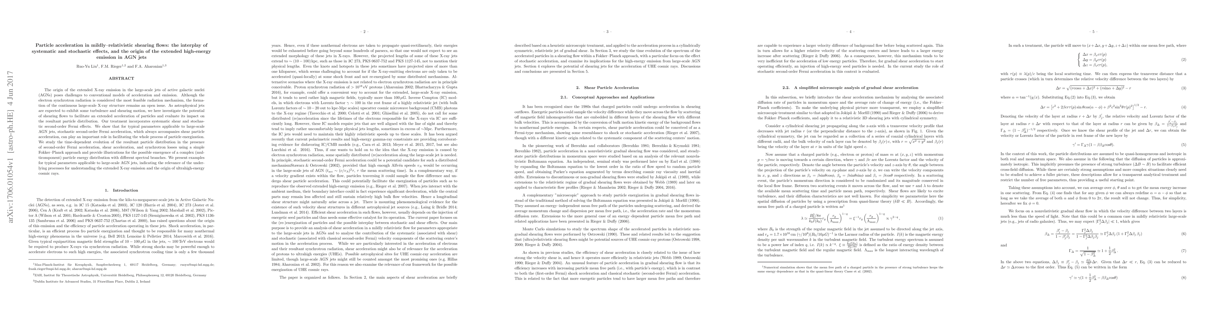 This paper investigates the role of shearing flows in particle acceleration within AGN jets, focusing on the interplay between systematic and stochastic effects. It demonstrates that stochastic second-order Fermi acceleration, alongside shear acceleration, significantly contributes to particle energization, potentially explaining the extended high-energy X-ray emission in AGN jets.