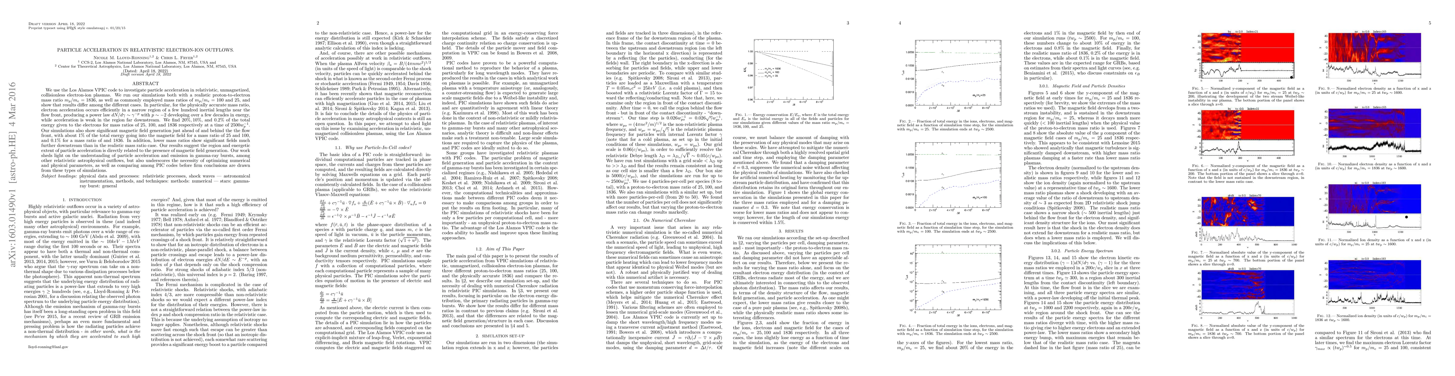 We use the Los Alamos VPIC code to investigate particle acceleration in relativistic, unmagnetized, collisionless electron-ion plasmas. We run our simulations both with a realistic proton-to-electron mass ratio m_p/m_e = 1836, as well as commonly employed mass ratios of m_p/m_e =100 and 25, and show that results differ among the different cases. In particular, for the physically accurate mass ratio, electron acceleration occurs efficiently in a narrow region of a few hundred inertial lengths near the flow front, producing a power law dN/dgamma ~ gamma^(-p) with p ~ -2 developing over a few decades in energy, while acceleration is weak in the region far downstream. We find 20%, 10%, and 0.2% of the total energy given to the electrons for mass ratios of 25, 100, and 1836 respectively at a time of 2500 (w_p)^-1. Our simulations also show significant magnetic field generation just ahead of and behind the the flow front, with about 1% of the total energy going into the magnetic field for a mass ratio of 25 and 100, and 0.1% for a mass ratio of and 1836. In addition, lower mass ratios show significant fields much further downstream than in the realistic mass ratio case. Our results suggest the region and energetic extent of particle acceleration is directly related to the presence of magnetic field generation. Our work sheds light on the understanding of particle acceleration and emission in gamma-ray bursts, among other relativistic astrophysical outflows, but also underscores the necessity of optimizing numerical and physical parameters, as well as comparing among PIC codes before firm conclusions are drawn from these types of simulations.