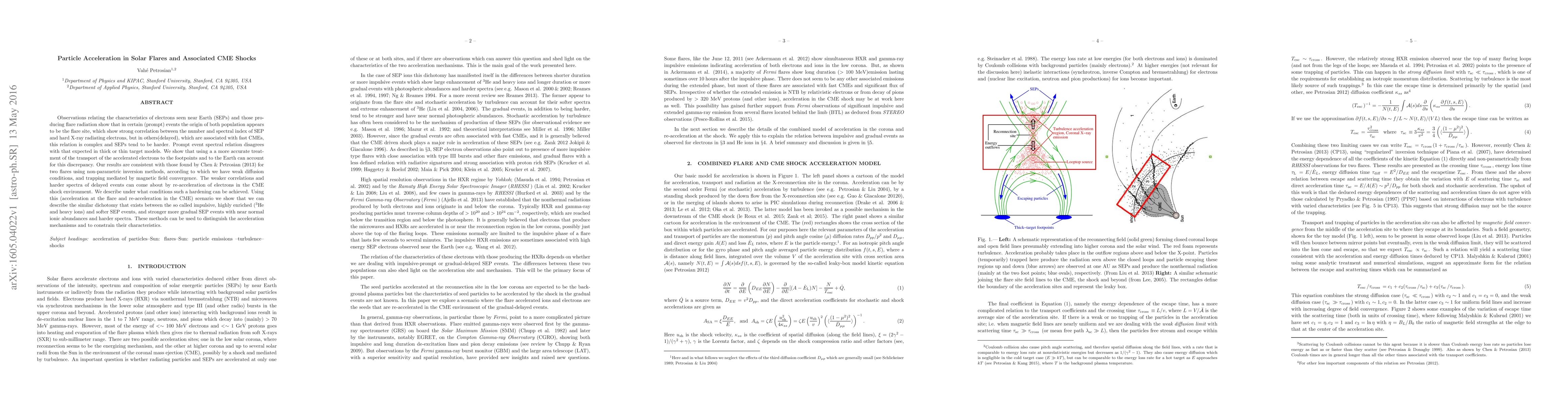 This paper explores the acceleration of electrons in solar flares and coronal mass ejections (CMEs), showing that prompt events correlate strongly with flare site electrons, while delayed events, linked to fast CMEs, exhibit harder spectra due to re-acceleration in CME shocks. The study proposes a model incorporating weak diffusion and magnetic field convergence to explain these phenomena.