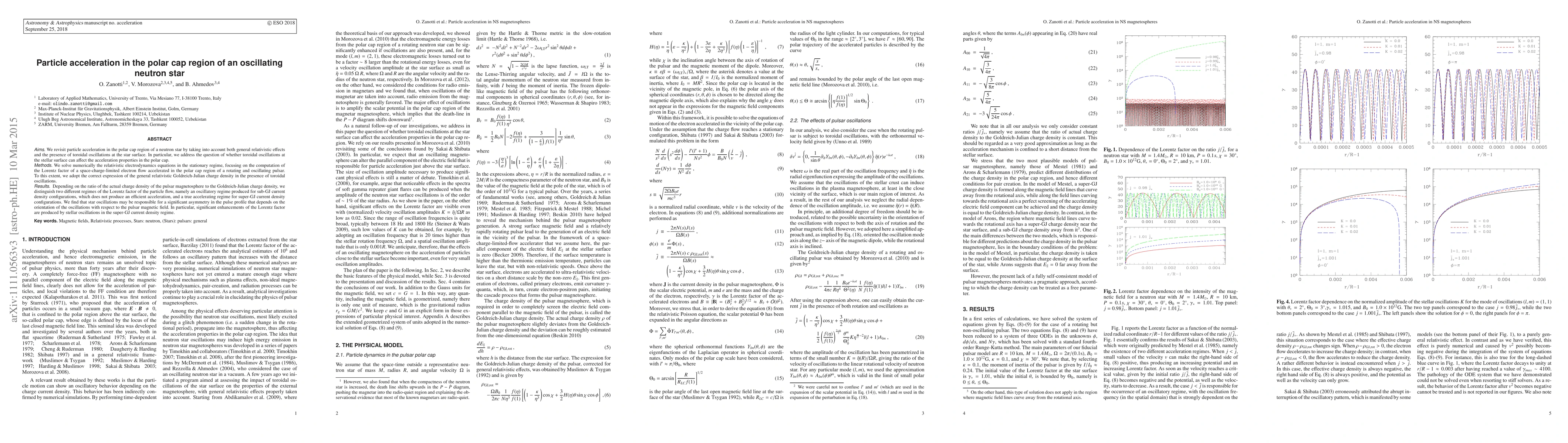 This paper investigates particle acceleration in the polar cap region of oscillating neutron stars, considering relativistic effects and toroidal oscillations. The study finds that oscillations can significantly enhance the Lorentz factor in super-Goldreich-Julian charge density regimes, leading to asymmetric pulse profiles dependent on oscillation orientation.
